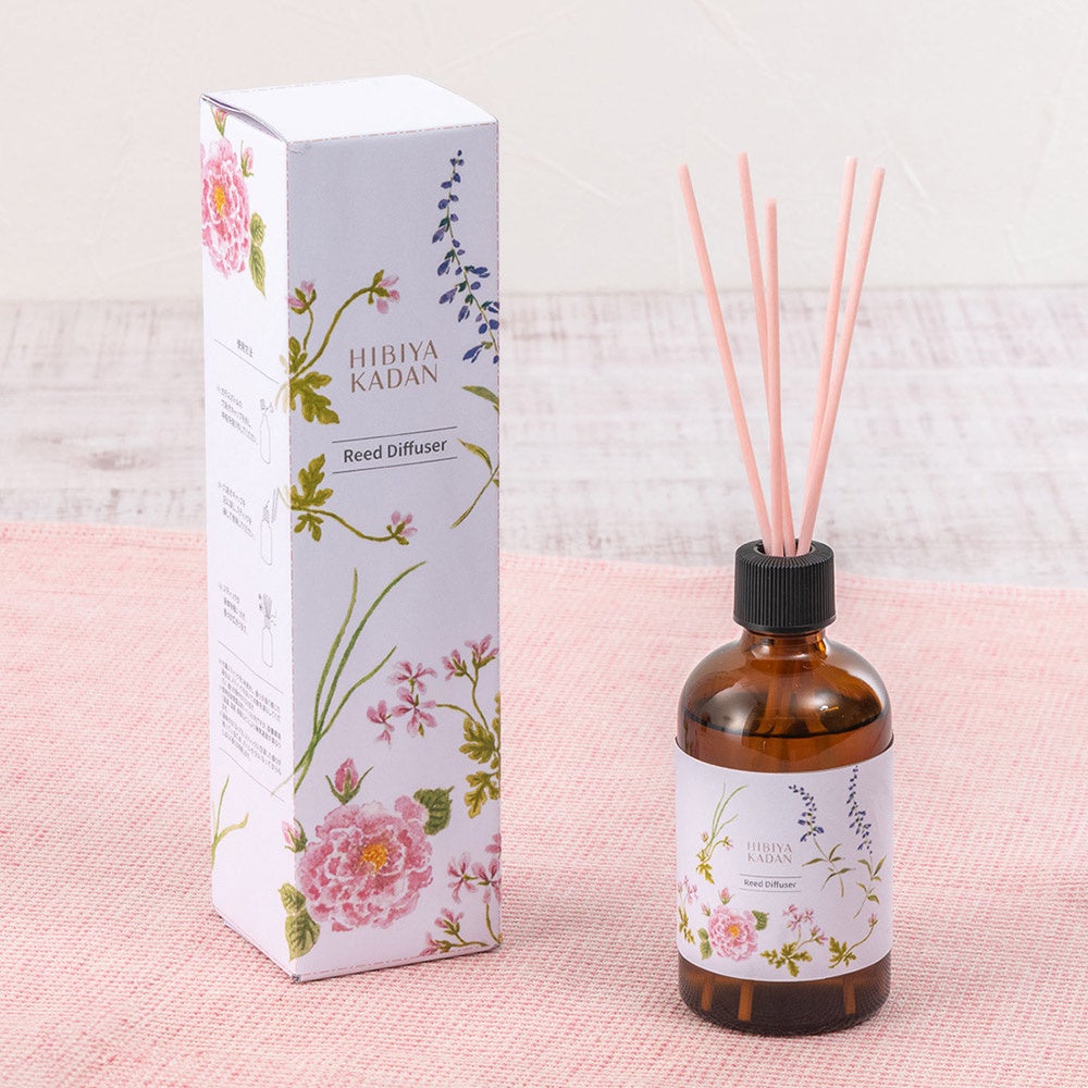 また、ディフューザーボトルのラベルシールとパッケージは、同じく日比谷花壇のフラワーデザイナーが、ブレンドされた花々を一つひとつ繊細なタッチで描き、デザインしました。どんなインテリアにも調和し、お部屋の雰囲気をワンランクアップさせるようなデザインとなっています。