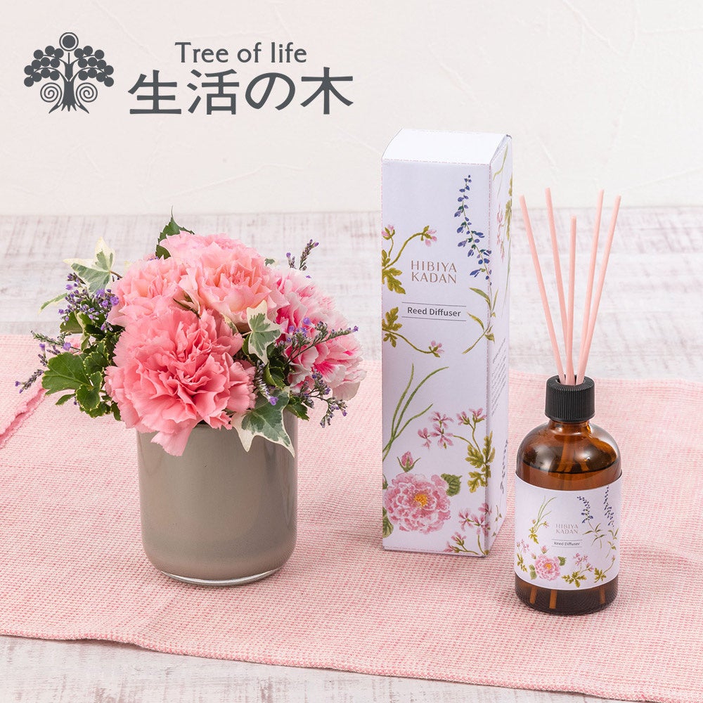 株式会社日比谷花壇(本社:東京都港区、代表取締役社長:宮島浩彰)は、株式会社生活の木(本社:東京都渋谷区、代表取締役:重永忠)とコラボレーションし、2025年4月5日(土)より、日比谷花壇が企画し、生活の木が調香した「日比谷花壇オリジナル リードディフューザー」を、全国の日比谷花壇店頭(※)で販売開始します。また、店頭販売に先駆け、日比谷花壇オンラインショップでは、オリジナルディフューザーと生花アレンジメントをセットにした母の日向けのフラワーギフトの受注を開始しました。