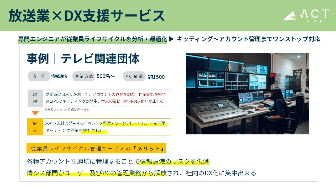 ホワイトペーパーでは、テレビ局関連企業従業員のPCキッティングからアカウント管理までワンストップまでアクトが行い、情報漏洩などのセキュリティリスクおよび情報システム担当の負担を軽減させる内容などを公開しています。