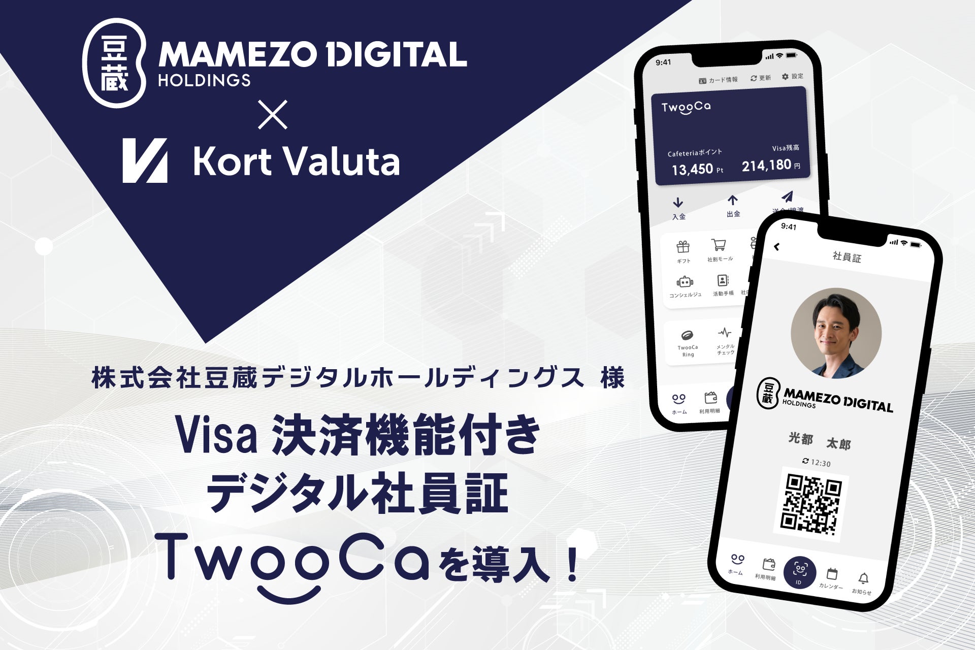 株式会社 Kort Valuta(本社:東京都渋谷区、代表取締役:柴田秀樹、以下「当社」)は、株式会社豆蔵デジタルホールディングス(証券コード202A:本社:東京都新宿区、代表取締役:中原徹也、以下「豆蔵デジタルホールディングス」)が、当社のVisa決済機能付きデジタル社員証『TwooCa』を導入したことをお知らせいたします。