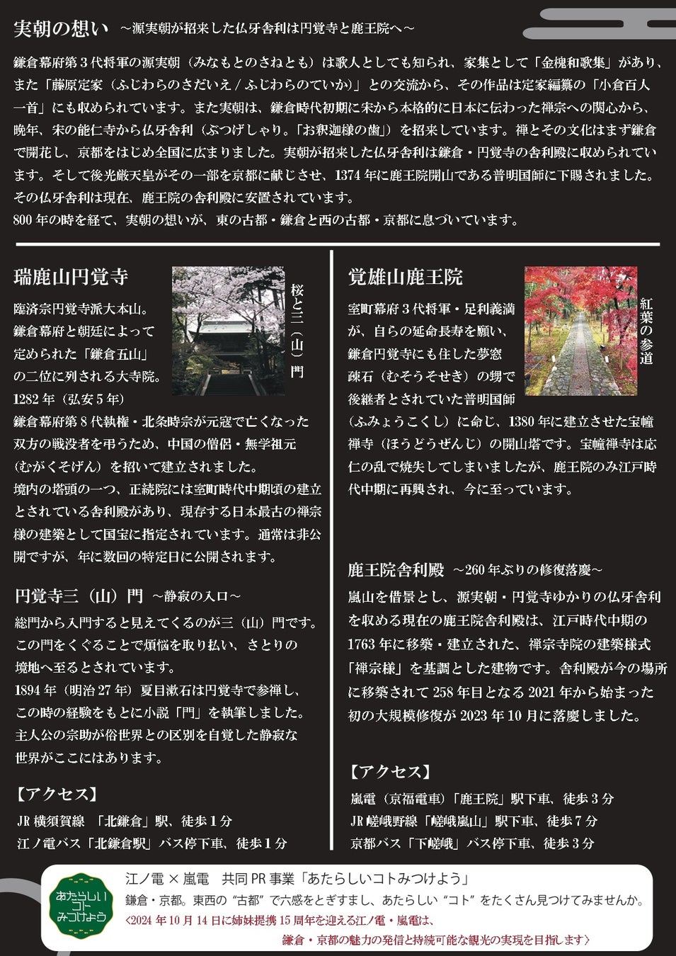 歴史的な重要文化財を有する両寺院の協力を得ながら、江ノ電・嵐電姉妹提携15周年記念として、鎌倉と京都という古都を繋ぐ架け橋として分散観光を促す新しい魅力をPR。