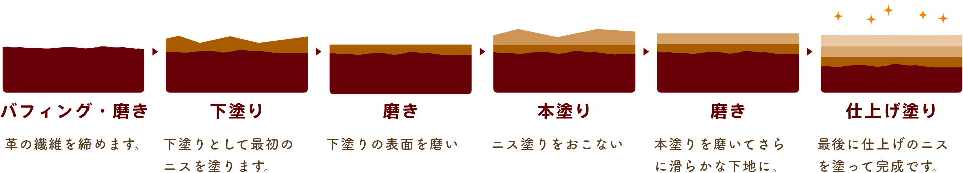 「コバを磨いてニスを塗る」という工程を3回〜4回繰り返して、ようやく完成するコバ塗り。一つひとつ手作業で行うため、1日に仕上げられる数も限られますが、手間がかかる分、より美しく上品なシルエットを生み出すことができます。