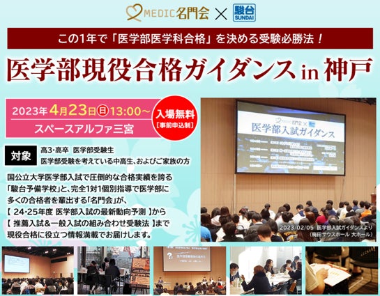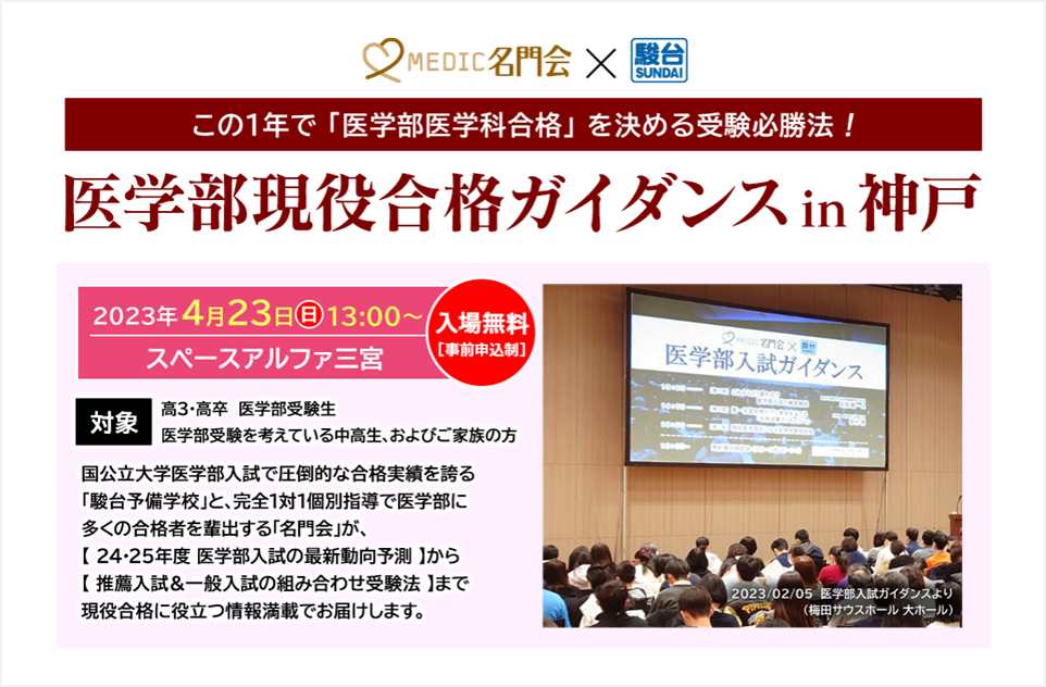【 MEDIC名門会×駿台予備学校 】“2023年4月 医学部現役合格ガイダンス”を神戸で開催 ~新課程入試前(24年度)・後(25年度)の医学部入試の最新動向予測と合格必勝法をお届け~
