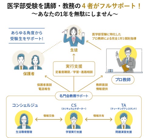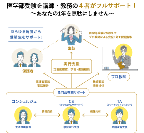 医学部受験に挑む受験生を、授業時間のみならず、自学自習・生活・メンタルなど あらゆる面から徹底サポートするのがMEDIC名門会です。選抜された正社員の「カリキュラムサポーター【CS】 <学習全般の実行支援>」は、「ティーチングアシスタント【TA】 <問題演習のサポート>」と「コンシェルジュ <生活環境やメンタルケア>」とともに“ONE TEAM” になって受験生を徹底的にサポートし、医学部合格へ導きます。