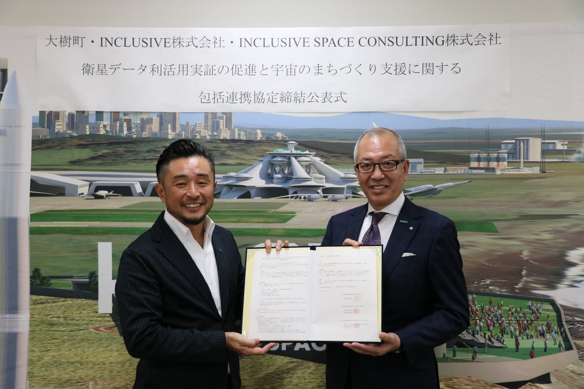 現在、同社が経済産業省の「サービスプロジェクト事業」における衛星データの無料利用事業者に採択され、当町にて衛星データを活用した乳牛の疾病と土壌診断に関する実証実験を開始しております。今回の協定締結を機に、これまで以上に連携・協力を図り、衛星データを活用した地域産業及び行政課題の解決に資する実証実験を、大樹町で実施していただき、その成果が衛星データの利活用の普及に寄与する取り組みとなるよう協働事業を進めていきたいと考えております。また、衛星データの利用に限らず、インクルーシブが持つ、情報発信力や企画力などをお借りし、宇宙のまちづくりの推進、産業・観光の振興を図り、北海道スペースポートの充実を図っていきたいと考えております。