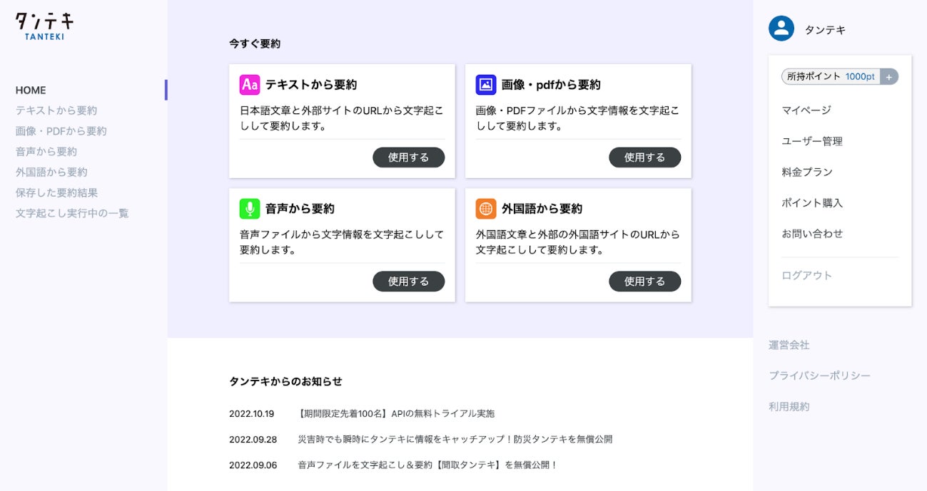 要約可能な文字数やアップロードできるデータ容量も大幅アップし、機能も追加されたタンテキで情報収集や業務効率化に是非ご活用ください。