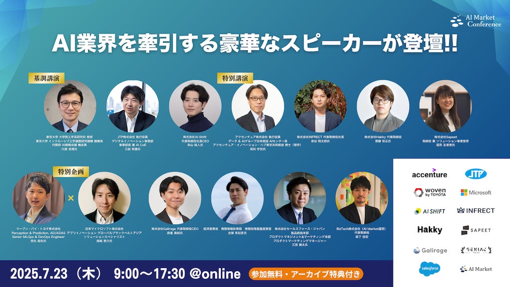 当日は、Sapeet社に加え、内閣府AI戦略会議 構成員を務める東京大学川原教授、アクセンチュアAIセンター長 保科氏の他、日本マイクロソフト社やウーブン・バイ・トヨタ社など豪華な講演者が多数登壇します!