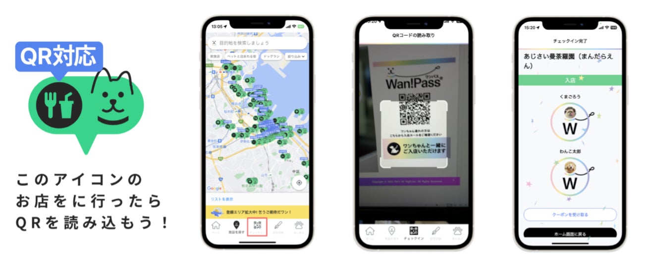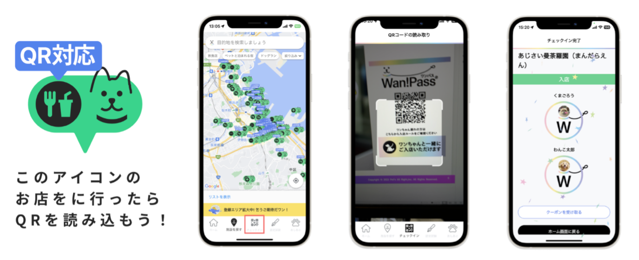 Wan!Pass(ワンパス)に掲載されている「QR対応」施設で、設置の専用QRを読み込むだけで「チェックイン」が完了し、下記が可能になる機能です。