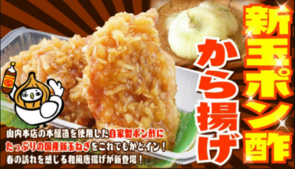山内本店の本醸造を使用した自家製ポン酢にたっぷりの国産新玉ねぎをこれでもかとイン!新玉ねぎのやさしい甘さや噛むほどに風味が増し、春の訪れを感じる和風から揚げが新登場!お花見のお供としてご飯、おつまみに相性抜群です!