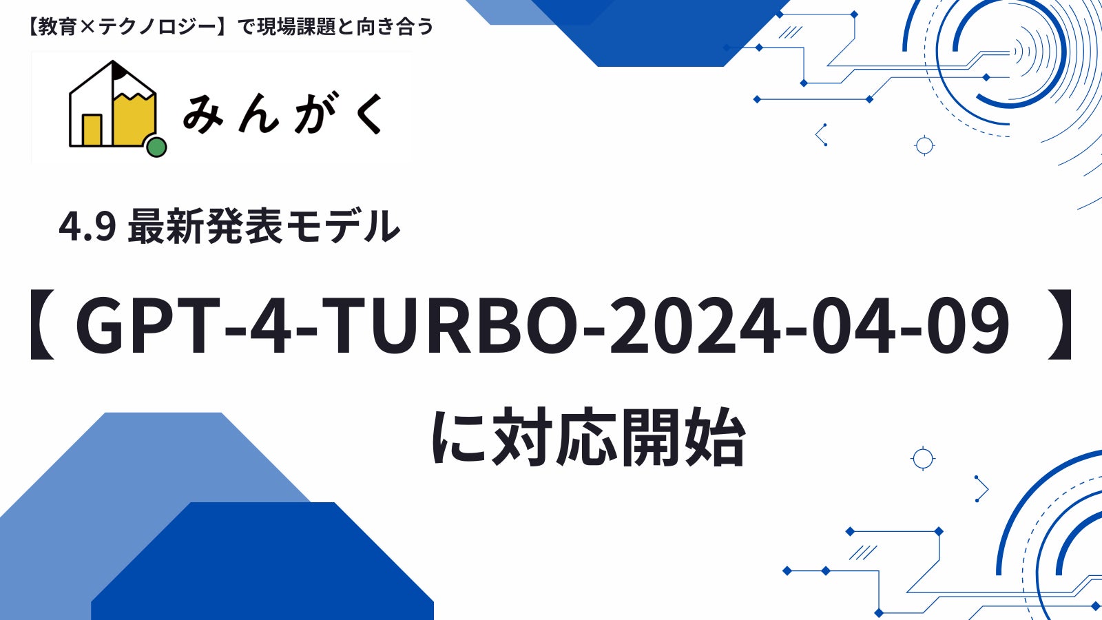 教育×生成AIで、教育サービスのプラットフォーム開発を手掛ける株式会社みんがく(本社:東京都目黒区、代表取締役:佐藤 雄太)は、「スクールAI」にて、米OpenAIが2024年4月9日(現地時間)に発表した新たなAPIモデル「gpt-4-turbo-2024-04-09」の対応を開始したことを発表します。