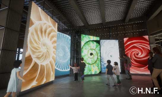 生命や自然の不思議さ、面白さを、「はんぶんはんぶん」「かくかく」「じわじわ」「ぐるぐる」の4つのキーワードに分けて展示。一見すると難しく感じる自然現象や法則も、自分の体や身近な生き物などと比較することで、新たな発見に出会えるかもしれません。