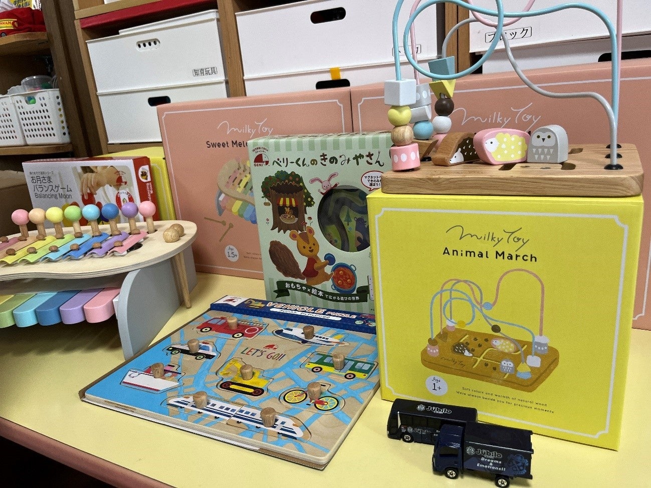 今回寄贈させていただいたのは、絵本とおもちゃがセットになった「えほんトイっしょ」シリーズのおもちゃや、優しい色味の「ミルキートイ」シリーズなど7点です。「えほんトイっしょ」は、絵本のストーリーに沿っておもちゃで遊ぶことで、主人公になりきって絵本の世界を体験でき、おもちゃで遊ぶのが更に楽しくなります。