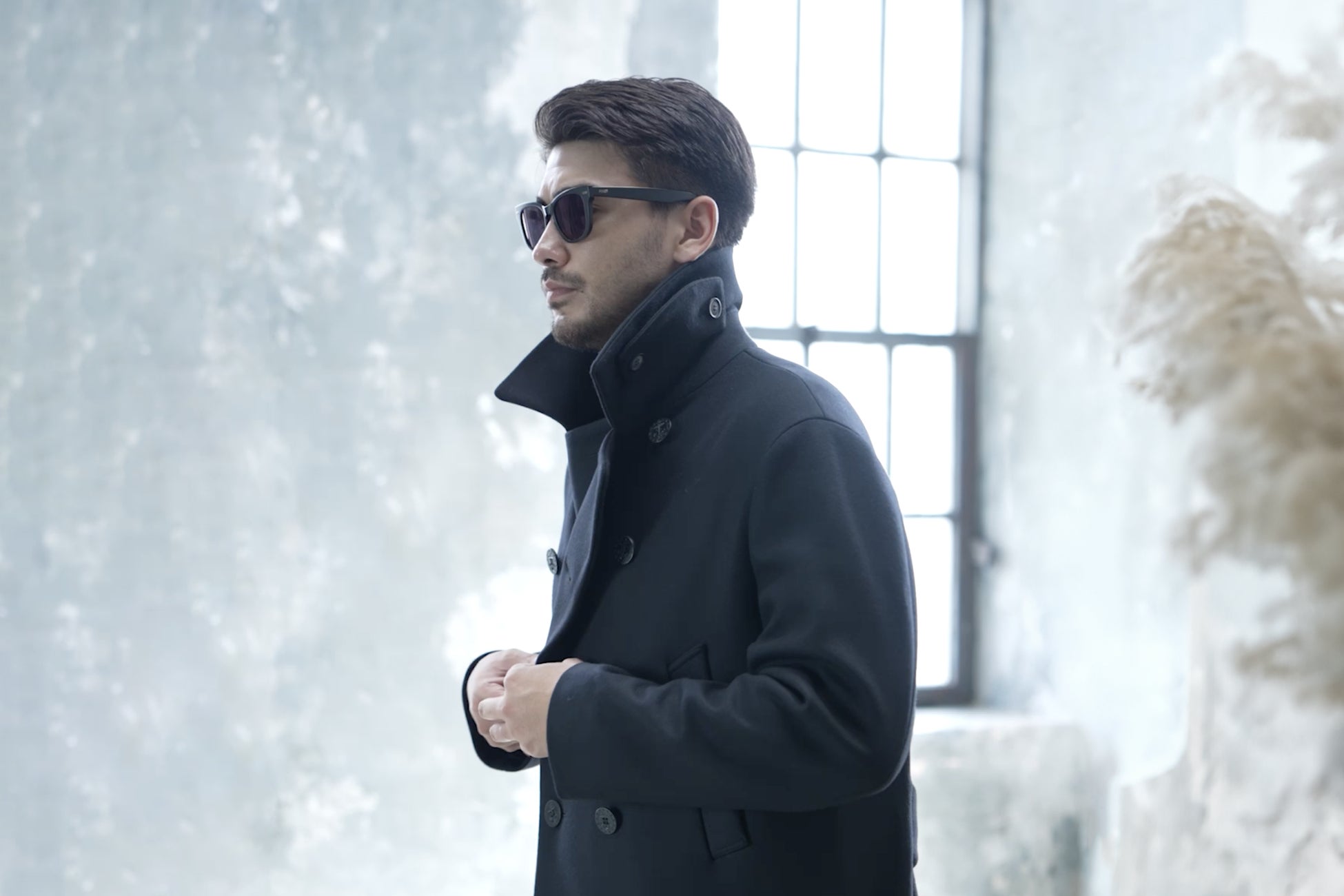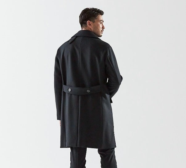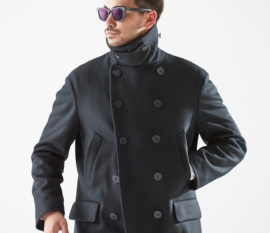 クラシカルなPコートの要素と現代的なシルエットの共存