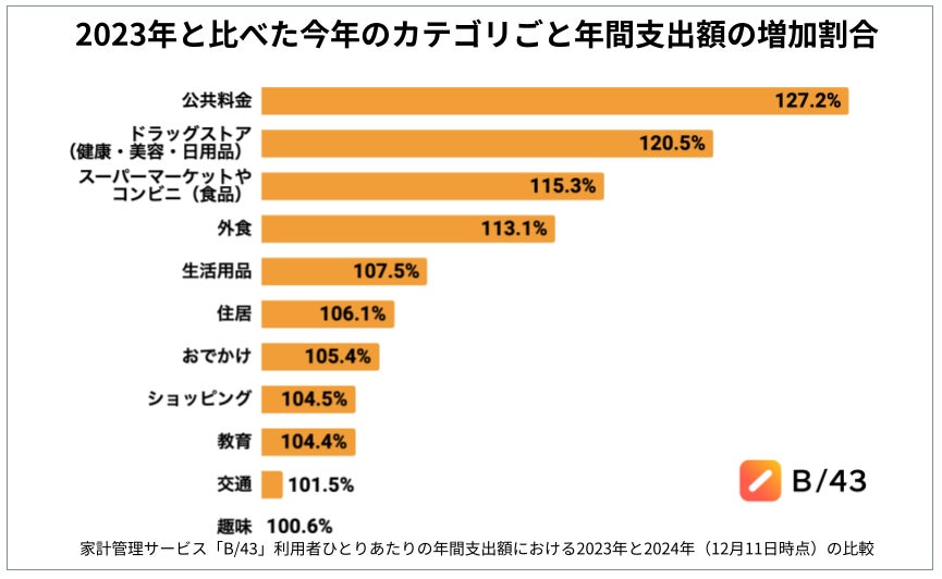 家計管理サービス「B/43(ビーヨンサン)」を提供する株式会社スマートバンクは、2024年の「今年の漢字」が「金」と発表されたことを受け、物価高騰が家計に与えた影響を調査しました。その結果、公共料金が前年比27%増で最も支出が増えたカテゴリとなり、日用品(20%増)、食品(15%増)と続きました。