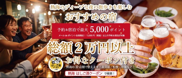 対象宿泊施設の予約と宿泊で、熱海の飲食店で使える「総額2万円以上のクーポン」と、楽天ポイント「最大5,000ポイント」獲得できるメルマガが届きます!まずは楽天ポイントモールからのメールをチェック!