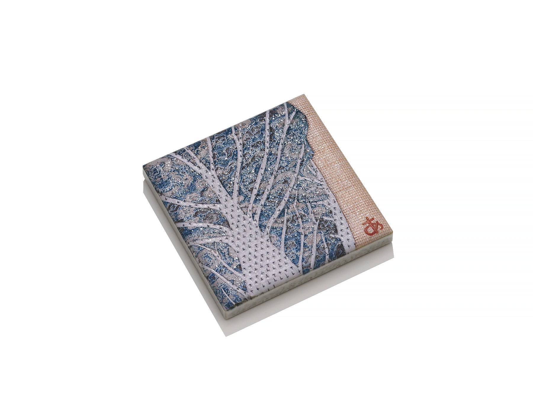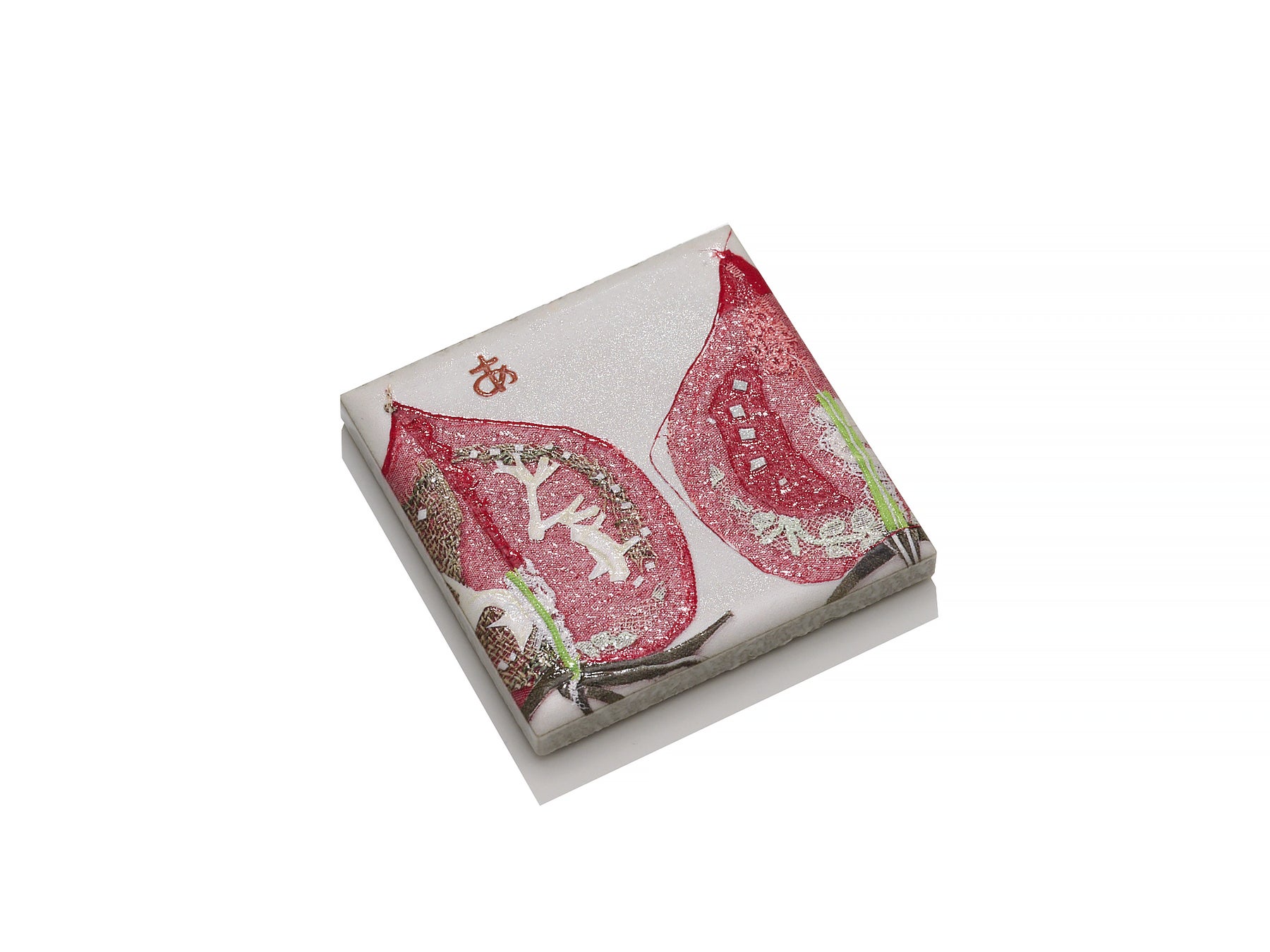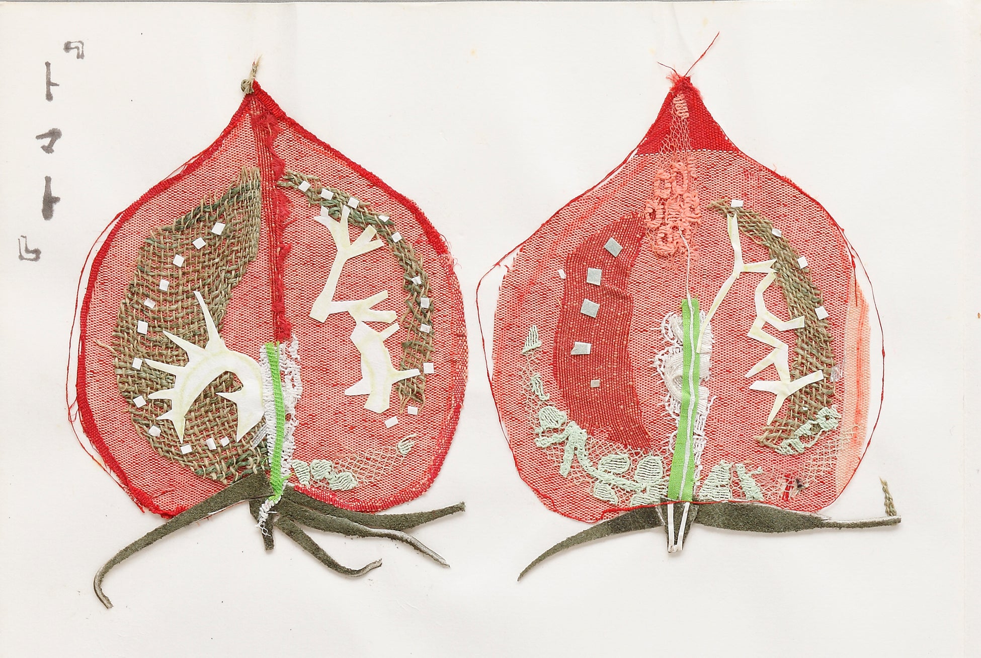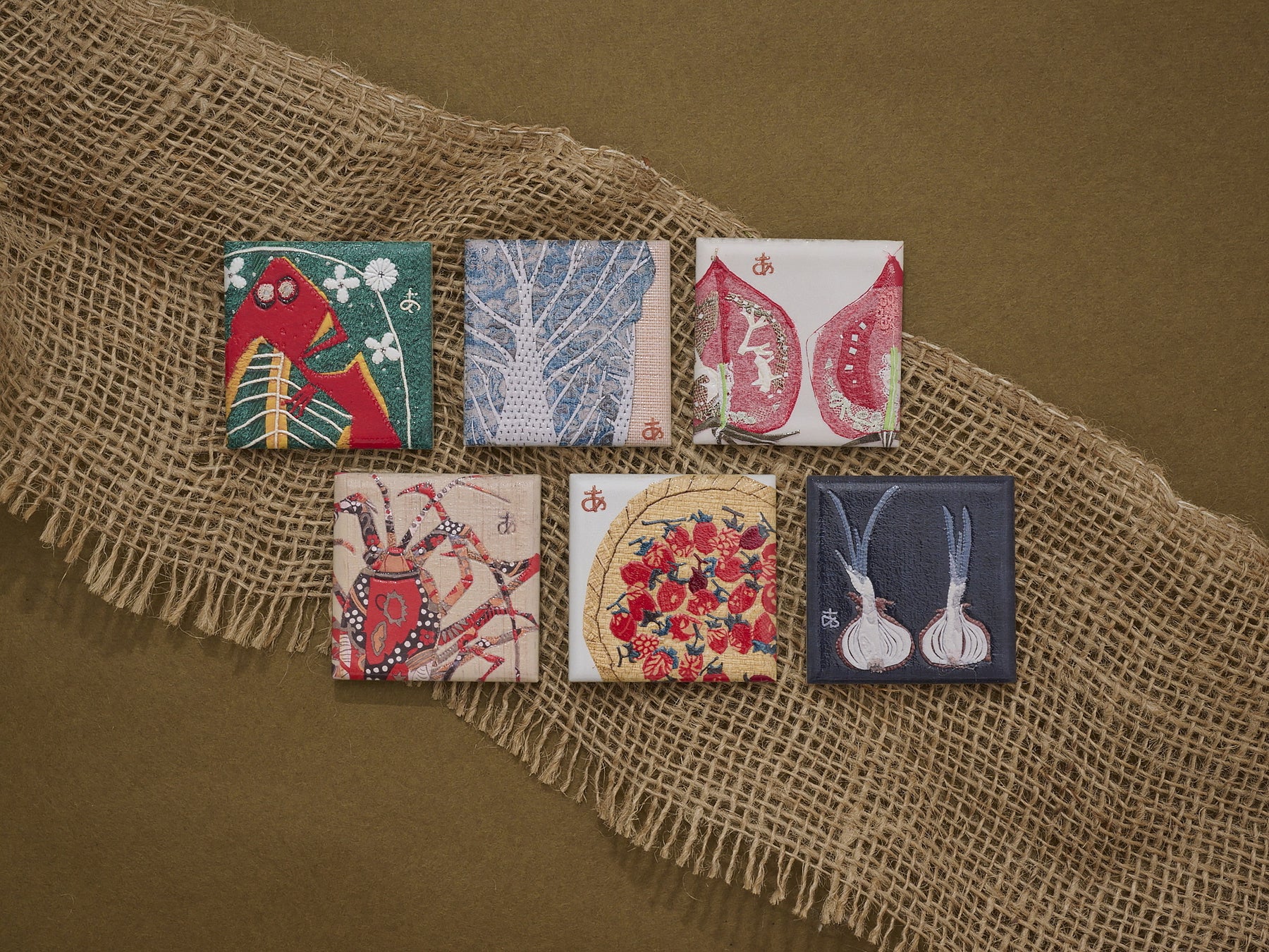 作者が日常を書き留めた絵日記「はりえ日記」の中で紹介されている作品の一つです。トマトの断面を異なる素材の組み合わせで表現しており、多種多様な布やレースが絶妙なバランスでデザインされています。マグネットのタイル上でも実物の質感を感じられるように、素材に合わせた凹凸をつけて立体化しました。作者の卓越した表現力と遊び心を感じることができるアイテムです。