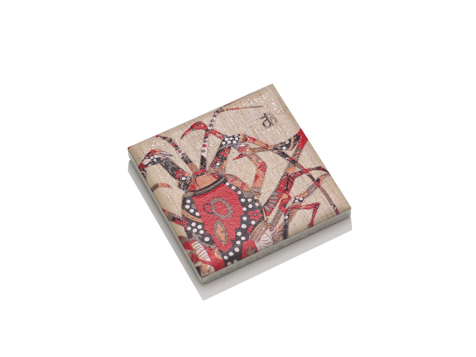 今にも動き出しそうな生き生きとした伊勢えびを、豪華な柄で表現している作品です。甲の丸みにはなめらかな光沢感を与え、細く鋭い触覚や、一本一本の脚の細部に至るまで丁寧に施された布の文様や織りの質感を引き立てるために、随所に微細な凹凸を加えています。少しも古さを感じさせない、斬新なデザインと鮮やかな色彩の中に、命の輝きを感じることができるアイテムです。