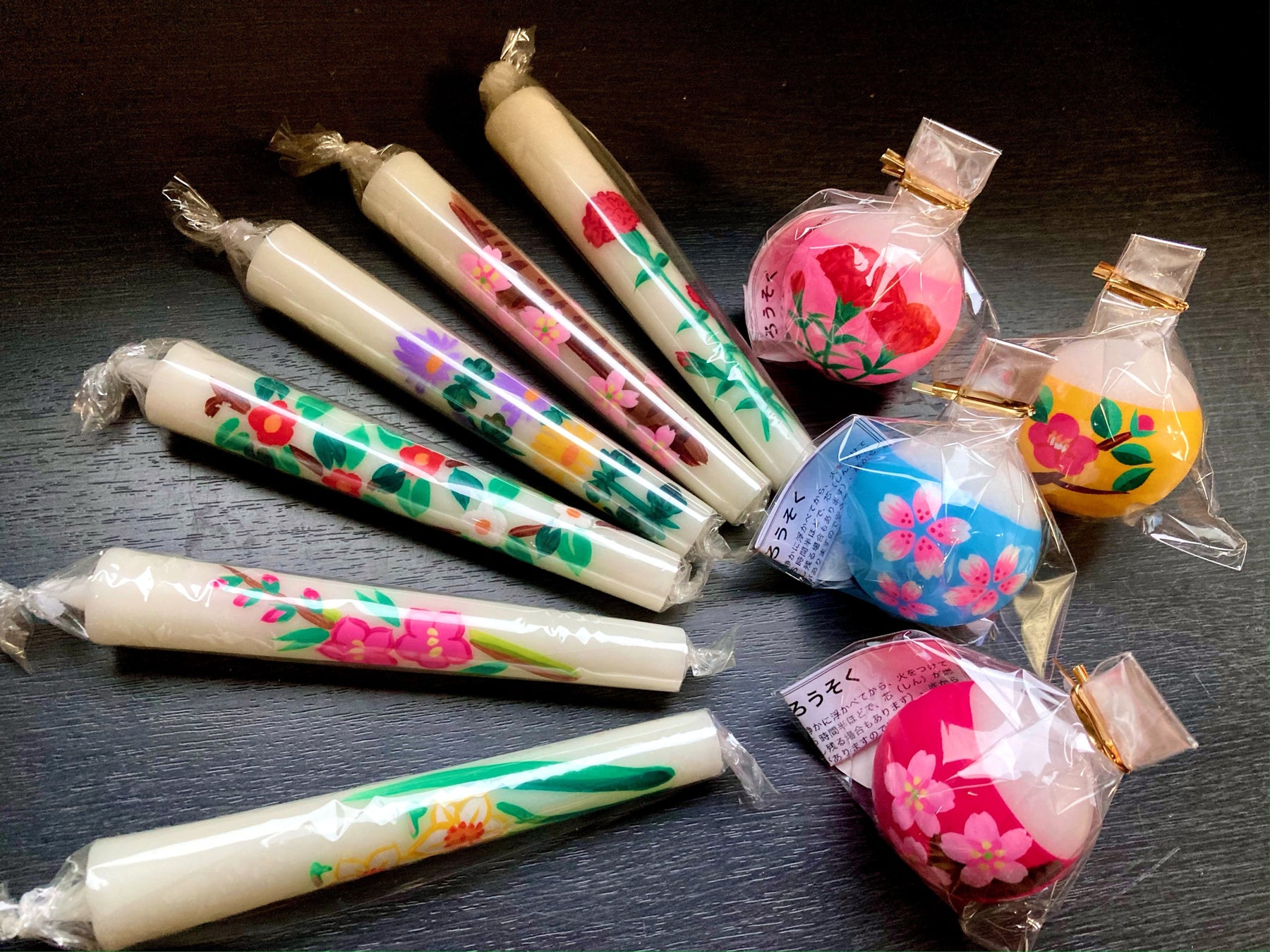ろうそくに絵具で絵付けをして、オリジナルの絵ろうそくが作れます。和型の細長いろうそくはもちろん、水に浮く丸いろうそくはプレゼントにも喜ばれる一品です。