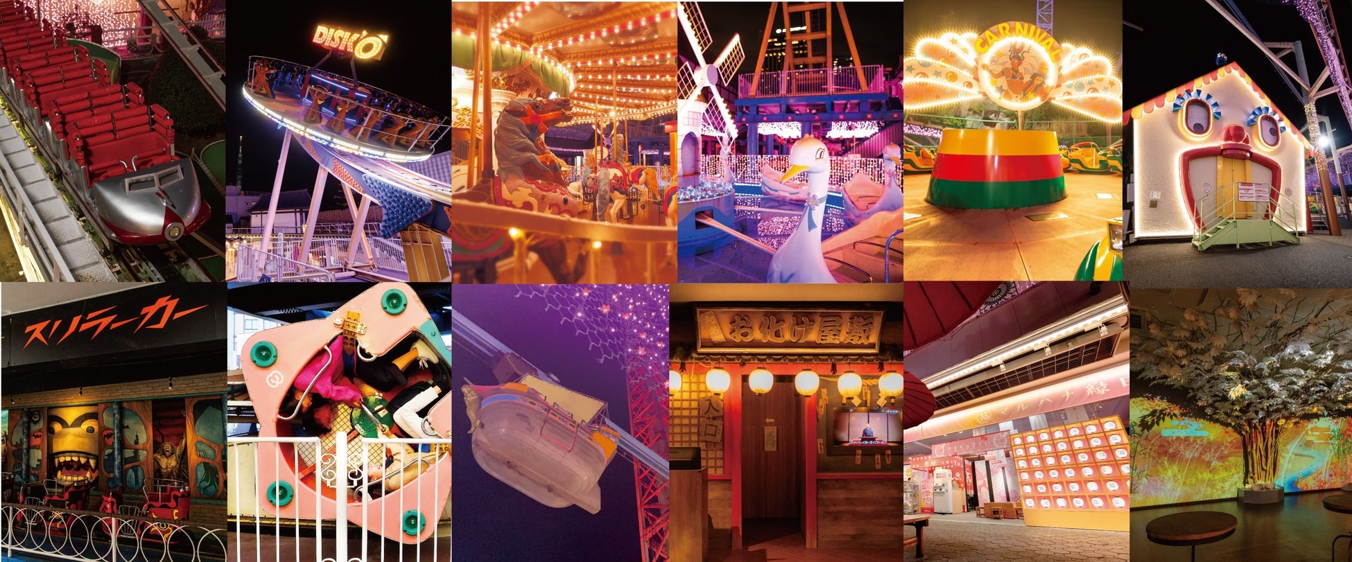 ローラーコースター、ディスク・オー、メリーゴーランド、スワン、カーニバル、ビックリハウス®、スリラーカー、リトルスター、スカイシップ、お化け屋敷