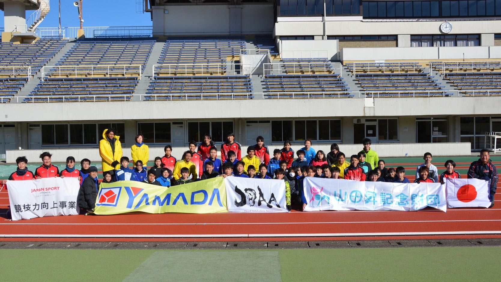 2021年12月26日(日)上尾運動公園陸上競技場にて、聴覚障がいを持つ子供たち34名を対象に開催された、公益財団法人山田昇記念財団主催の「デフ陸上教室」にヤマダホールディングス陸上競技部T&F(以降ヤマダ陸上部)所属の柏村亮太 選手、小田大樹 選手、2021年東京オリンピック400mH日本代表の安部孝駿 選手ら3名が講師として参加いたしました。