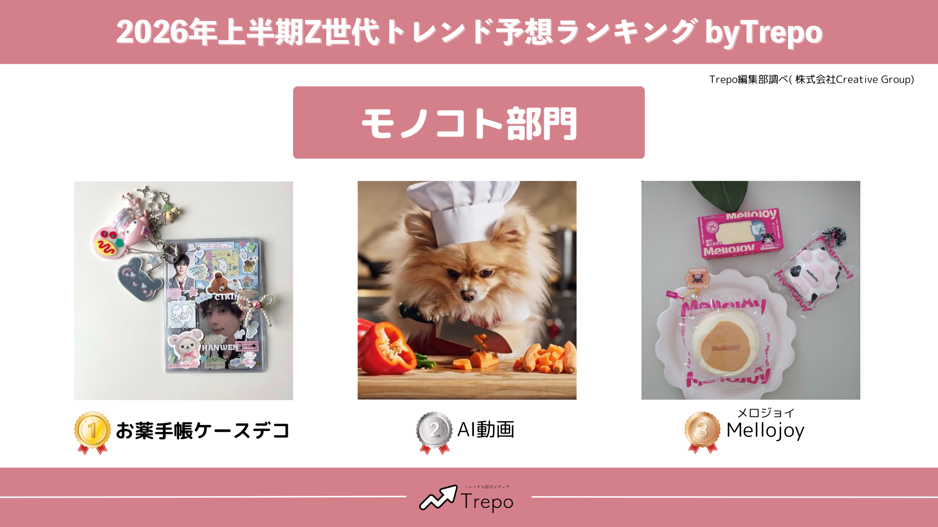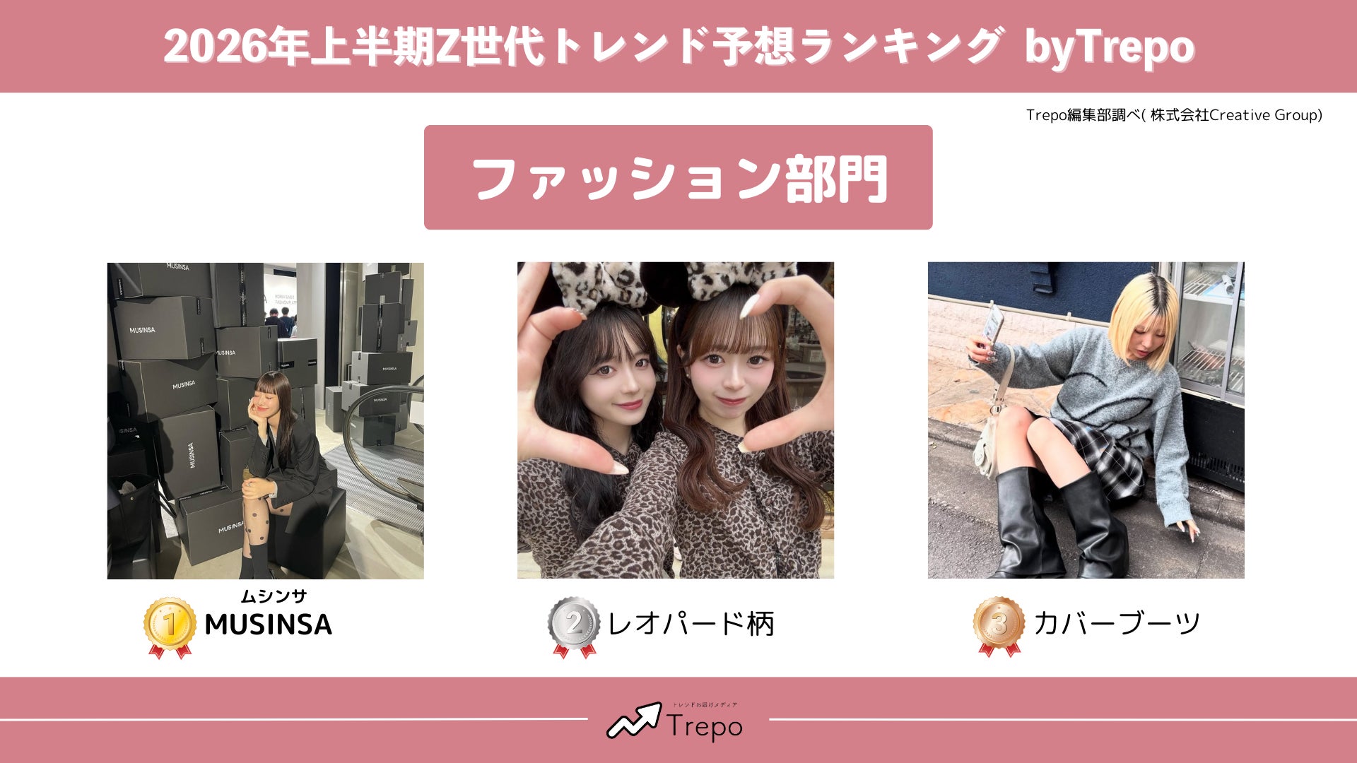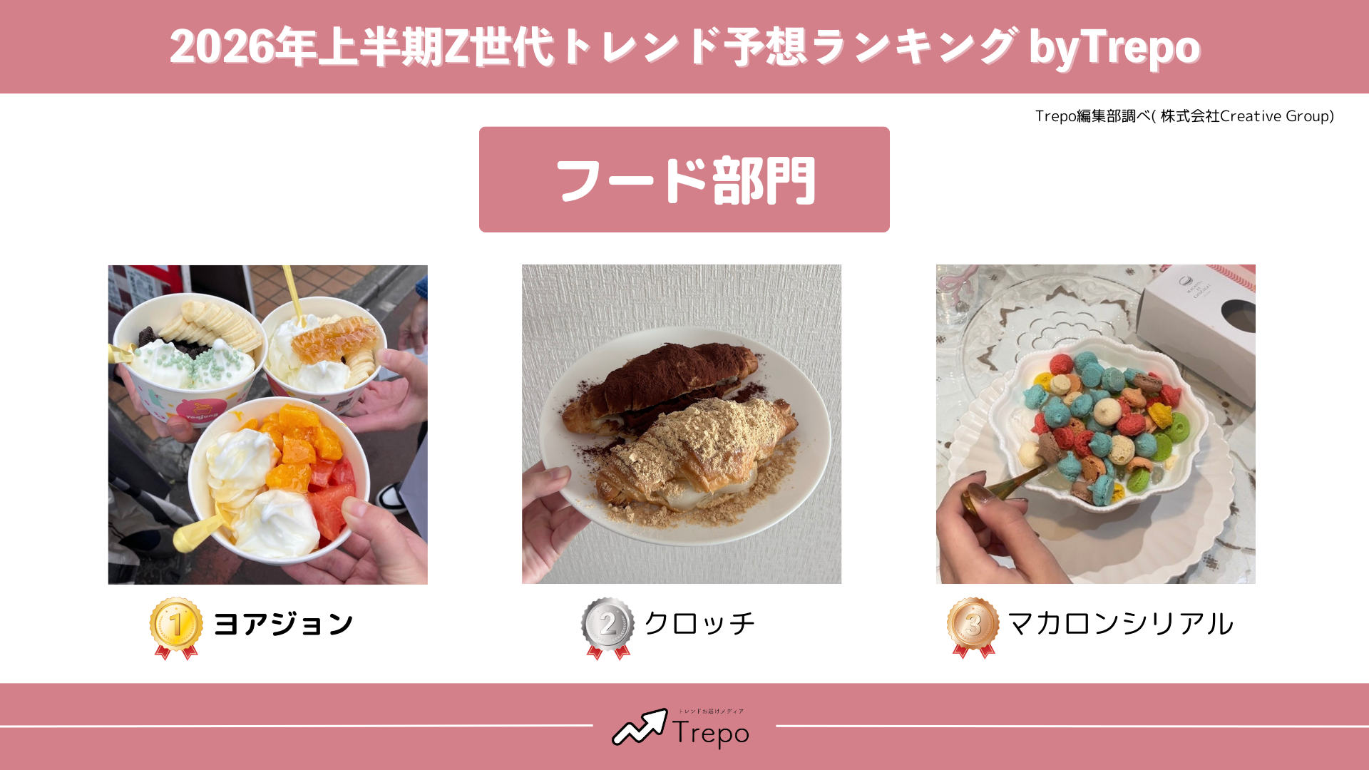 株式会社Creative Group(本社:東京都千代田区、代表取締役:中原一真)が運営する10代~20代女性向け『トレンドメディアTrepo(トレポ)』は、10代~20代の女性(Trepo girls)を対象に、2026年上半期のZ世代トレンド予想調査を行いました。WEBで実施したアンケート調査(以降「Trepo girls調査」)の結果をお知らせします。