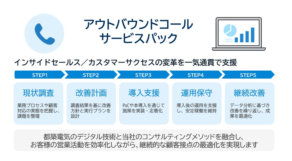 加えて近年では、インサイドセールス拡大や顧客の声(VOC=Voice of Customer)の収集強化など、「営業活動の属人化解消/営業プロセス改革」を実現するため、コンタクトセンターに期待される役割もさらに拡大しています。このような環境の中で、システム・技術領域における都築電気の実装力とマネジメント領域における当社のコンサルティング力とを組み合わせることで、センター運営における課題をより精緻に可視化し、改善に結びつける協業体制を構築しました。