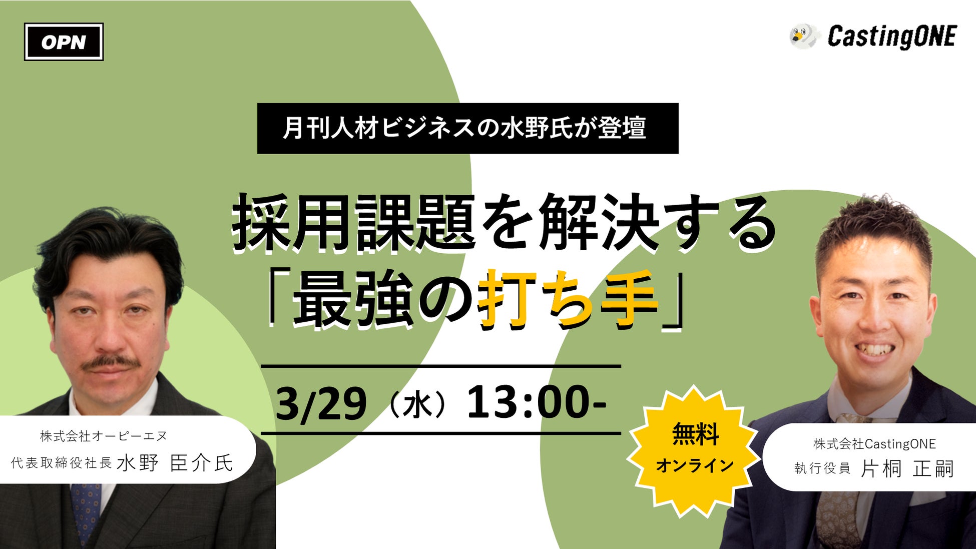 株式会社CastingONE(キャスティングワン、本社:東京都千代田区、代表取締役:野澤 怜司)は、業界専門誌「月刊人材ビジネス」を発刊する株式会社オーピーエヌ・代表取締役社長の水野氏をゲストに迎えて「採用課題の打ち手」をテーマにしたセミナーを開催いたします。