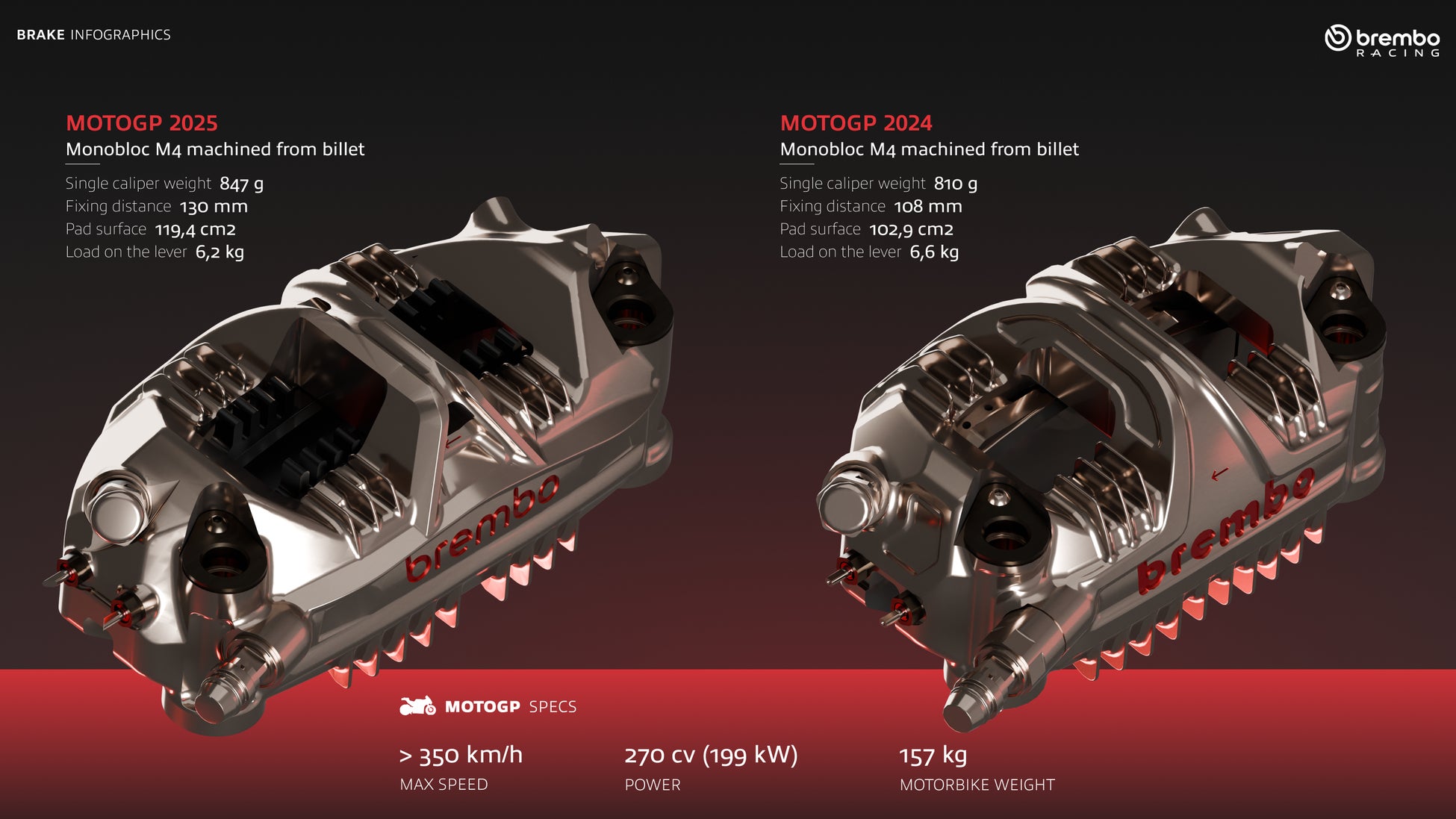 MotoGPのブレーキングインスピレーションパートナーを務めるブレンボは、2025年シーズンから22名の全選手に新しいレーシングキャリパーを提供します。この最先端キャリパーには、制動力と放熱性を高める大型パッドを採用したほか、ブレーキングエリアを広げることで接地圧と正確な制御を最適化し、キャリパー/台座固定ホイールベースを強化することで安定性と精度を改善しました。