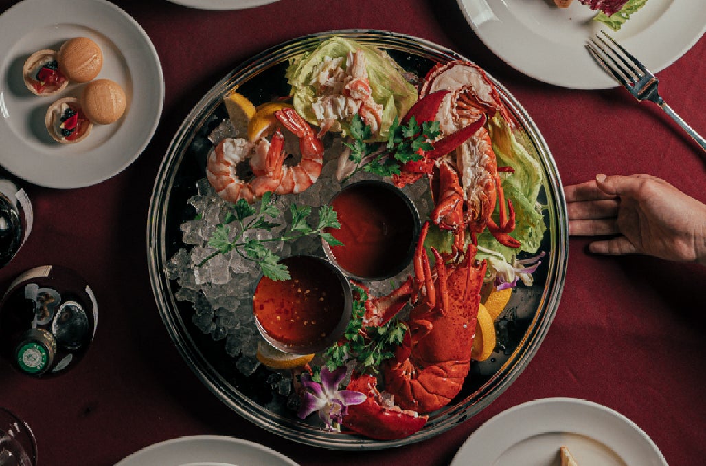 ロブスターをはじめ旬の海の幸を大皿盛りで楽しめるRe : Wharfのもう一つのメインディッシュ。旨味の強い旬のシーフードはライムかレモンでシンプルに楽しむか、特製のカクテルソースでお召し上がりください。