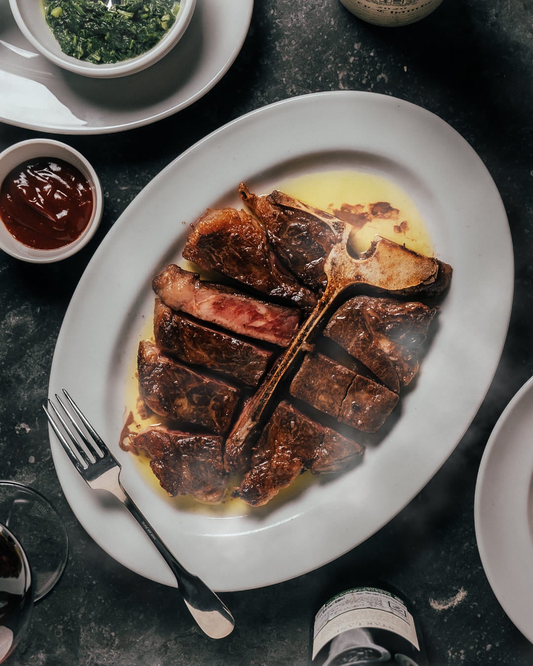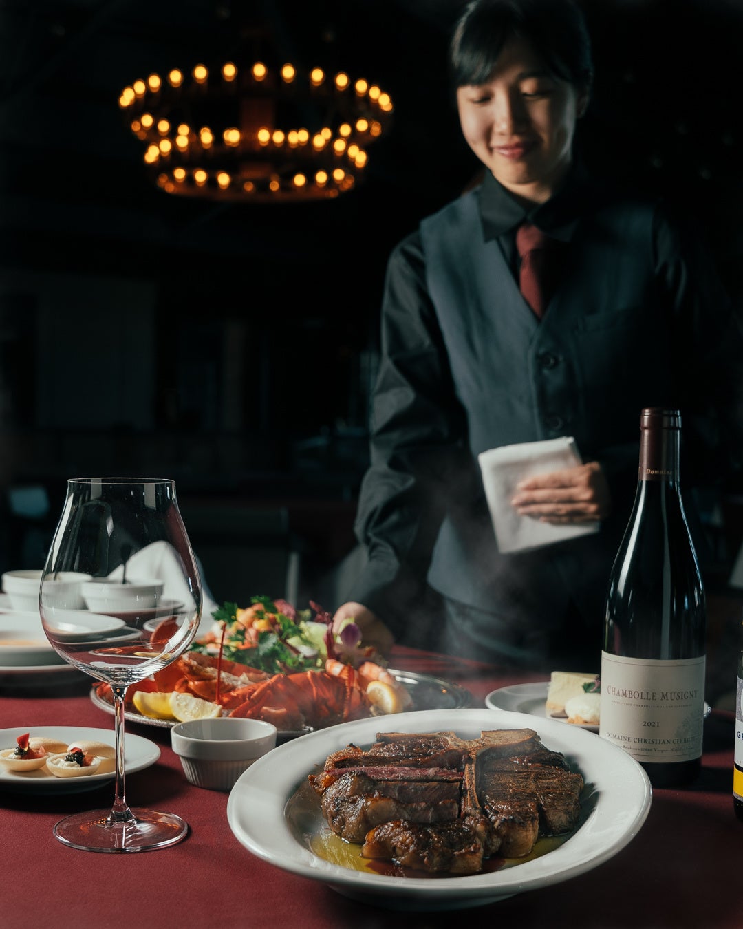 店の看板メニューとなるNYスタイルのTボーンステーキは、USビーフのなかでも全体からごく僅かしかとれない希少性と、その味わいの良さから、格付けでは最高ランクに位置するUS プライムビーフを使用。肉汁が滴るジューシーさ、柔らかな食感が特徴のUS プライムビーフを熟成させることでさらに旨みを凝縮させています。特注オーブンで一気に焼きあげたステーキだからこそ味わえる熟成による芳醇な肉の香り、噛むほどに溢れる旨みをぜひ、ご堪能ください。