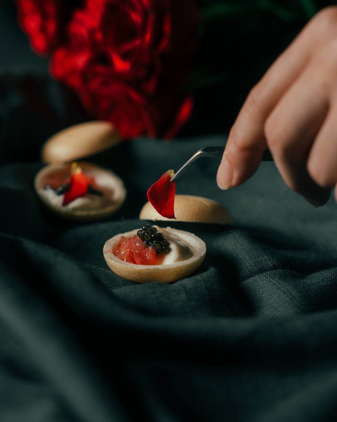 一口大の最中のなかに、ホイップリコッタとグレープフルーツルビー、キャビアを入れ、アクセントに横浜市花であるバラを添えています。