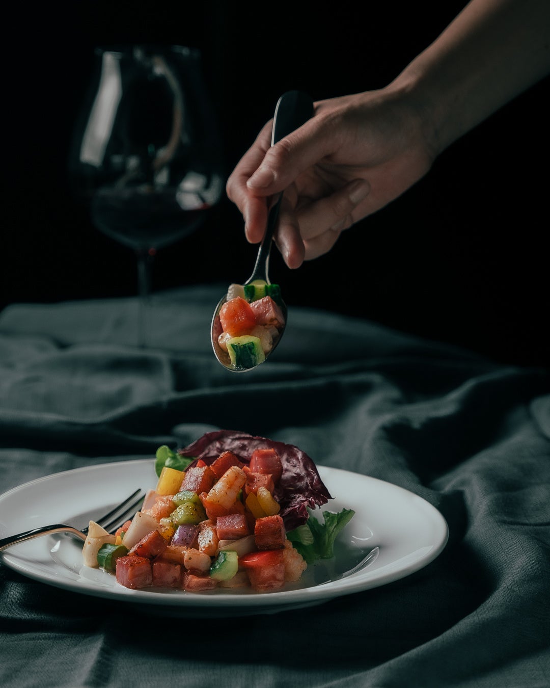 横浜の地物の旬の野菜と焼きたてのベーコンを使った食べ応えあるサラダで、野菜の味と香りだけでなく、食感も楽しんでもらうためにキューブ型にカットしています。9種のスパイスを効かせており、メインの脇を固めるだけでなく、ワインとの相性も良いです。