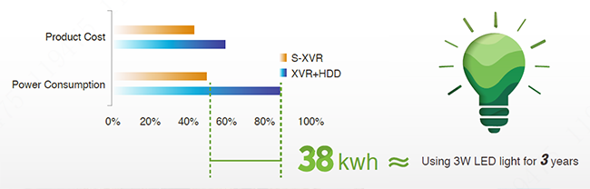 ・持続可能:24時間365日の連続運転が必要なシナリオでは、S-XVRは1年間に少なくとも38kWhの電力を節約できます。これは約3年間、3WのLEDライトの消費電力に相当します。HDD搭載XVRと比較して、優れた省エネ性能という利点があります。