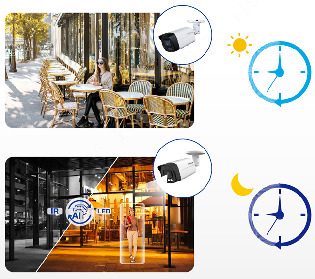 HDCVI 2023のスマートデュアルライト機能は、監視シーンでのフルカラーのビデオと重要なイベントの情報を記録します。ターゲットが検出されると、ウォームライト(暖色光)と赤外線(IRライト)が自動的に切り替わり、光害を効果的に軽減します。AI XVRのディープラーニングアルゴリズムを活用して、ターゲットを正確に検出・フィルタリングし、誤報を減らします。DMSSアプリのワンクリック機能を使用して、イルミネーションモードを柔軟に切り替えることができます。また、ユーザーは時間帯毎に設定を行うことで、イルミネーションモードをスケジュール曜日ごとに設定・管理ができる機能を搭載しています。