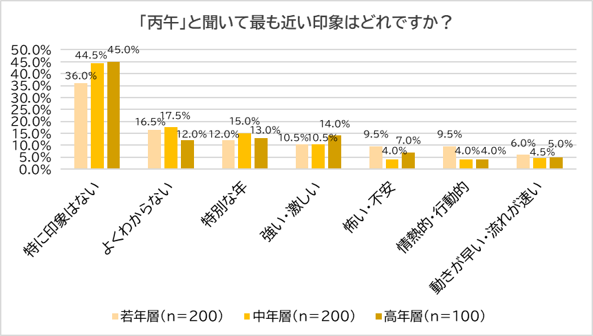 最後に、「丙午と聞いて最も近い印象は何か」と尋ねました。全世代共通で最も多かったのは「特に印象はない」(若年層:36.0%、中年層:44.5%、高年層:45.0%)でした。