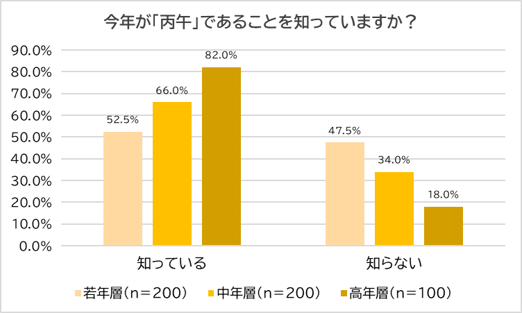 続いて、「今年が丙午であることを知っているか」と尋ねたところ、年代差が明確に表れました。若年層では「知っている」が52.5%と半数程度にとどまったのに対し、中年層では66.0%、高年層では82.0%が認知しており、年齢が上がるほどの年意識が高いことがわかりました。