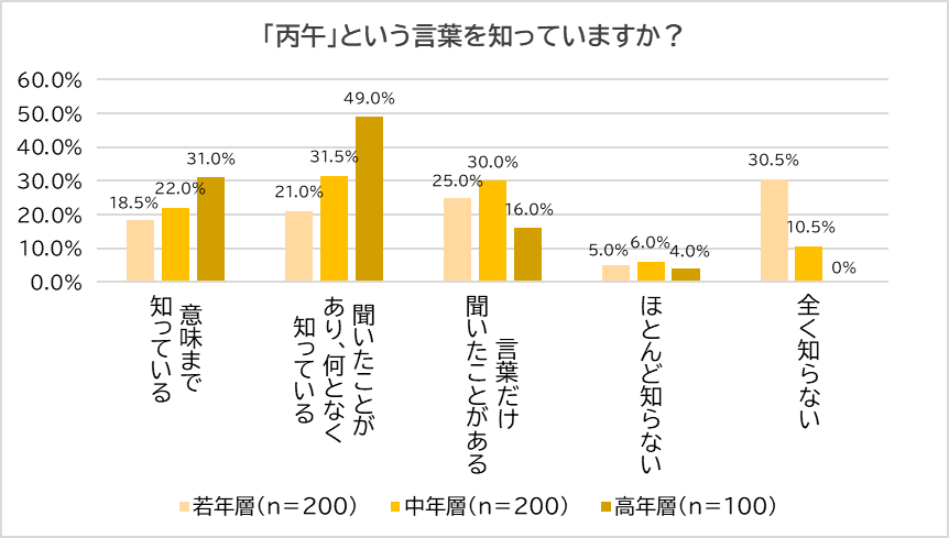 一方で若年層では、「全く知らない」と回答した人が3割を超えており、丙午という言葉が十分に共有されていない実態も浮き彫りになりました。