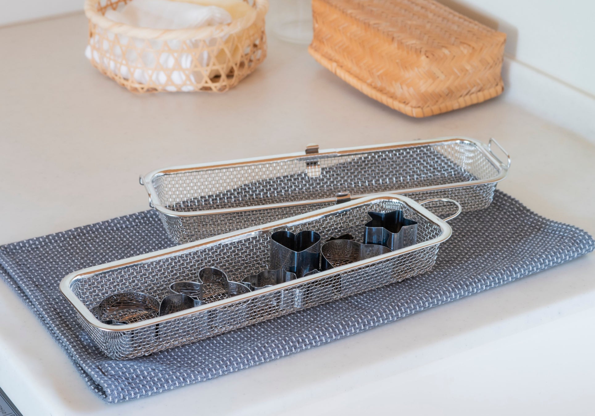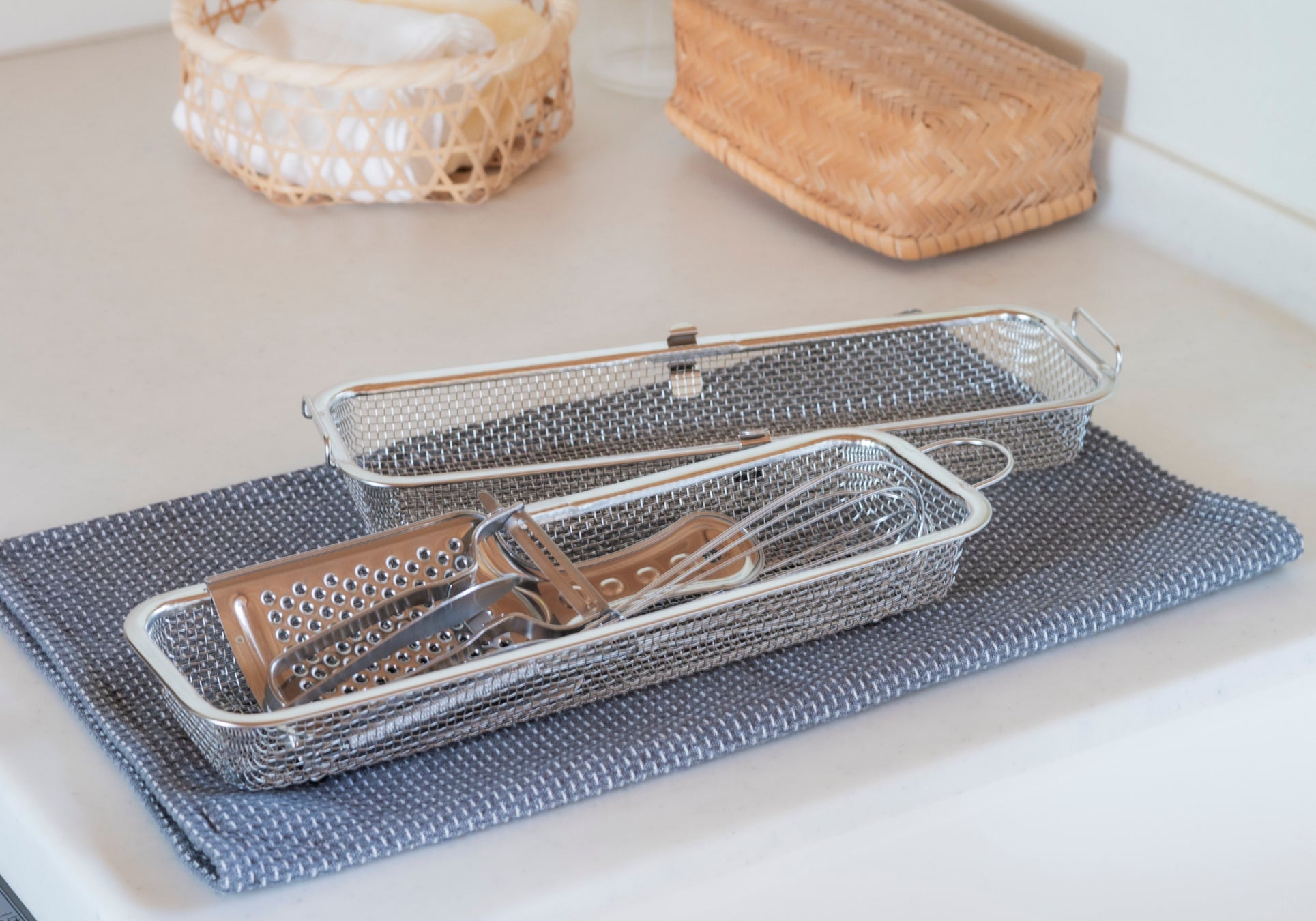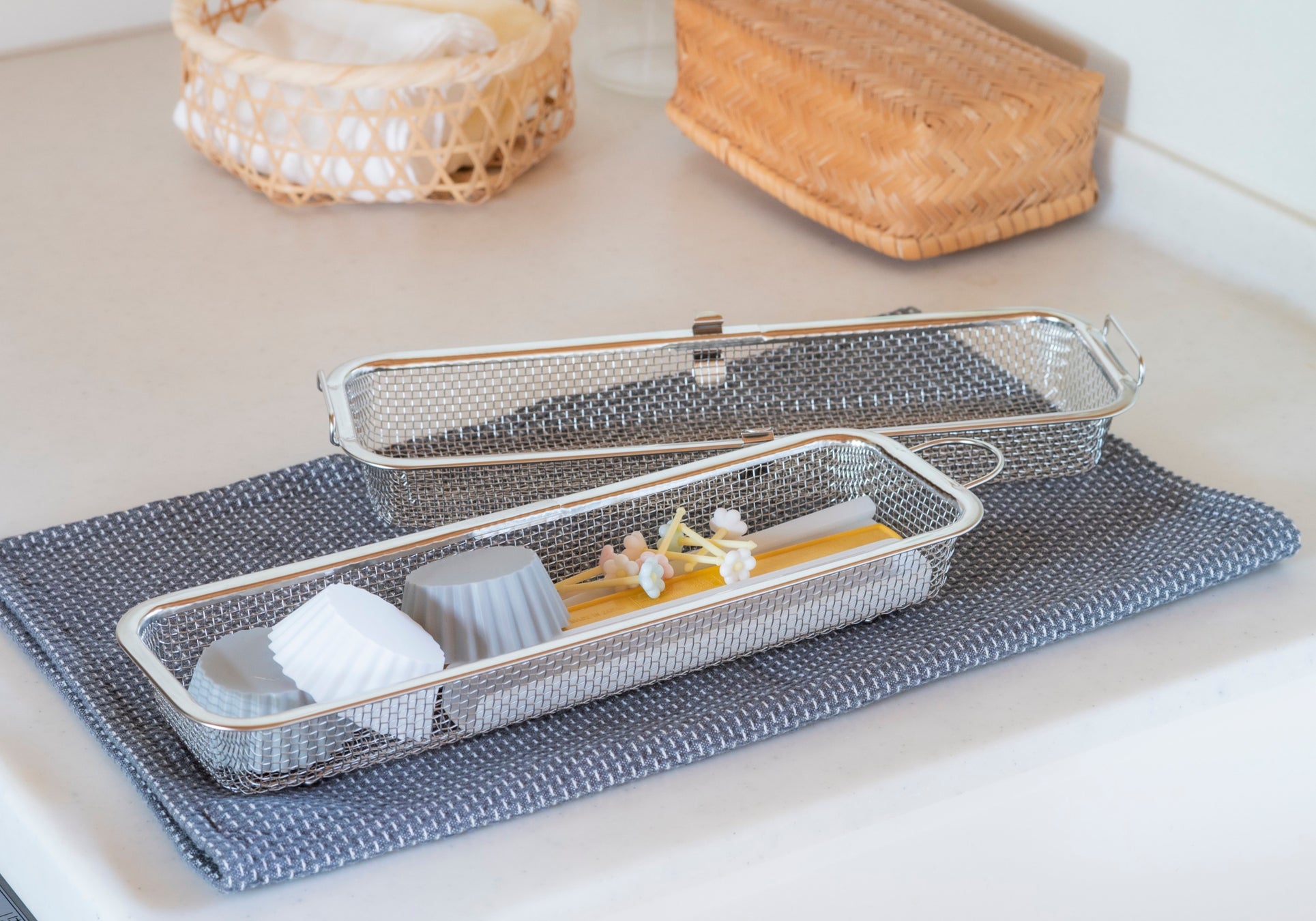 一般的な製品に比べてかご内寸の高さがあり、容量も多いため、水筒のフタまで食洗機で洗えると好評だった従来品。その特長をさらに進化させ、容量を一段と増やした本製品では、「食洗機に入れたかったけれど従来品では入らなかったもの」をまとめて洗浄できるようになりました。