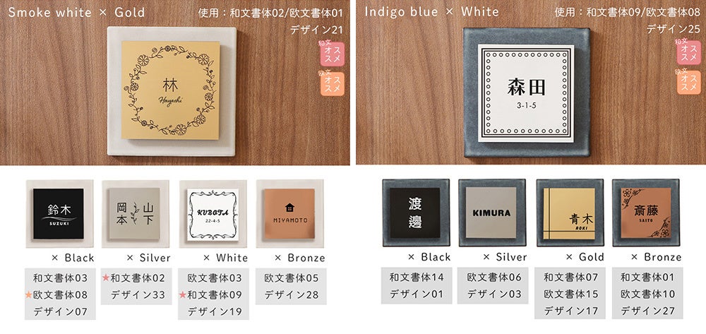 表札の注文方法はとても簡単!ベースとなる美濃焼タイルのシリーズ、カラーを選び、お名前など加工するアクリルプレートのカラー、表記する内容と文字の書体を選ぶだけ。と、いってもお家の顔となる表札。迷ってしまう方も多いと考え、どのシリーズにもデザイナー「推し」のおすすめマークを入れています。迷ったときはそちらからお選びください。