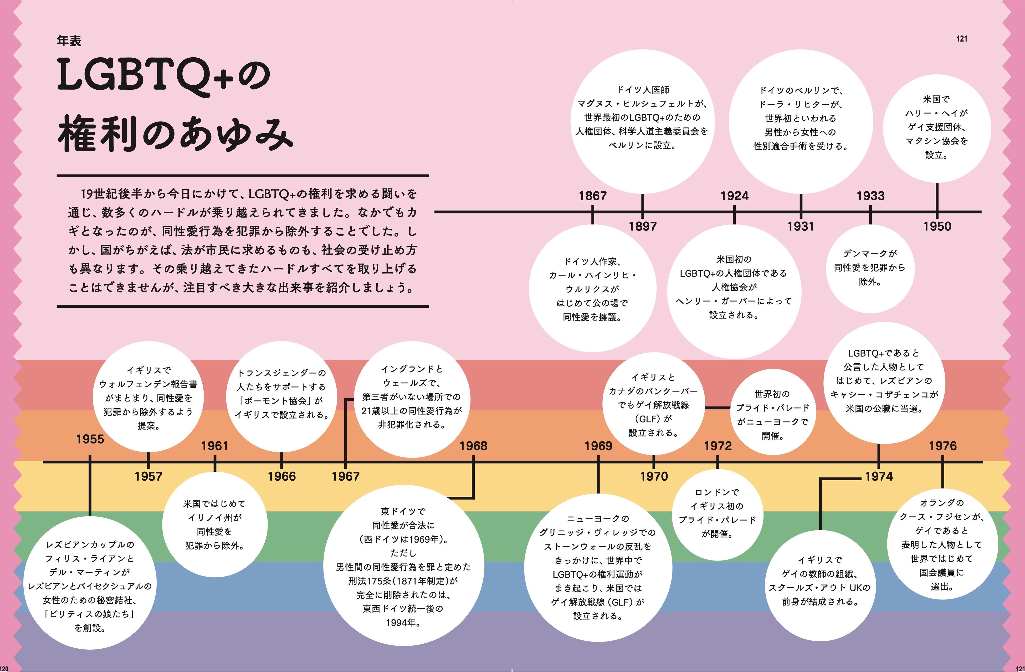 ◉LGBTQ+であることを公表した著名人のプライドの軌跡が、ライトなコラムにまとめられている。
