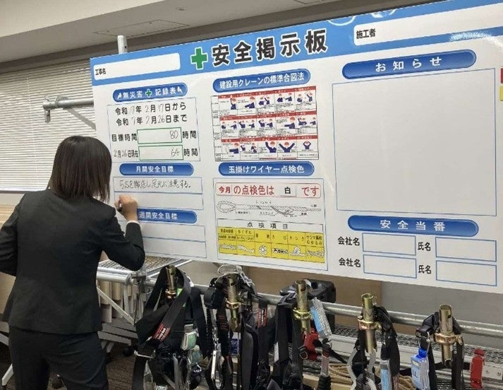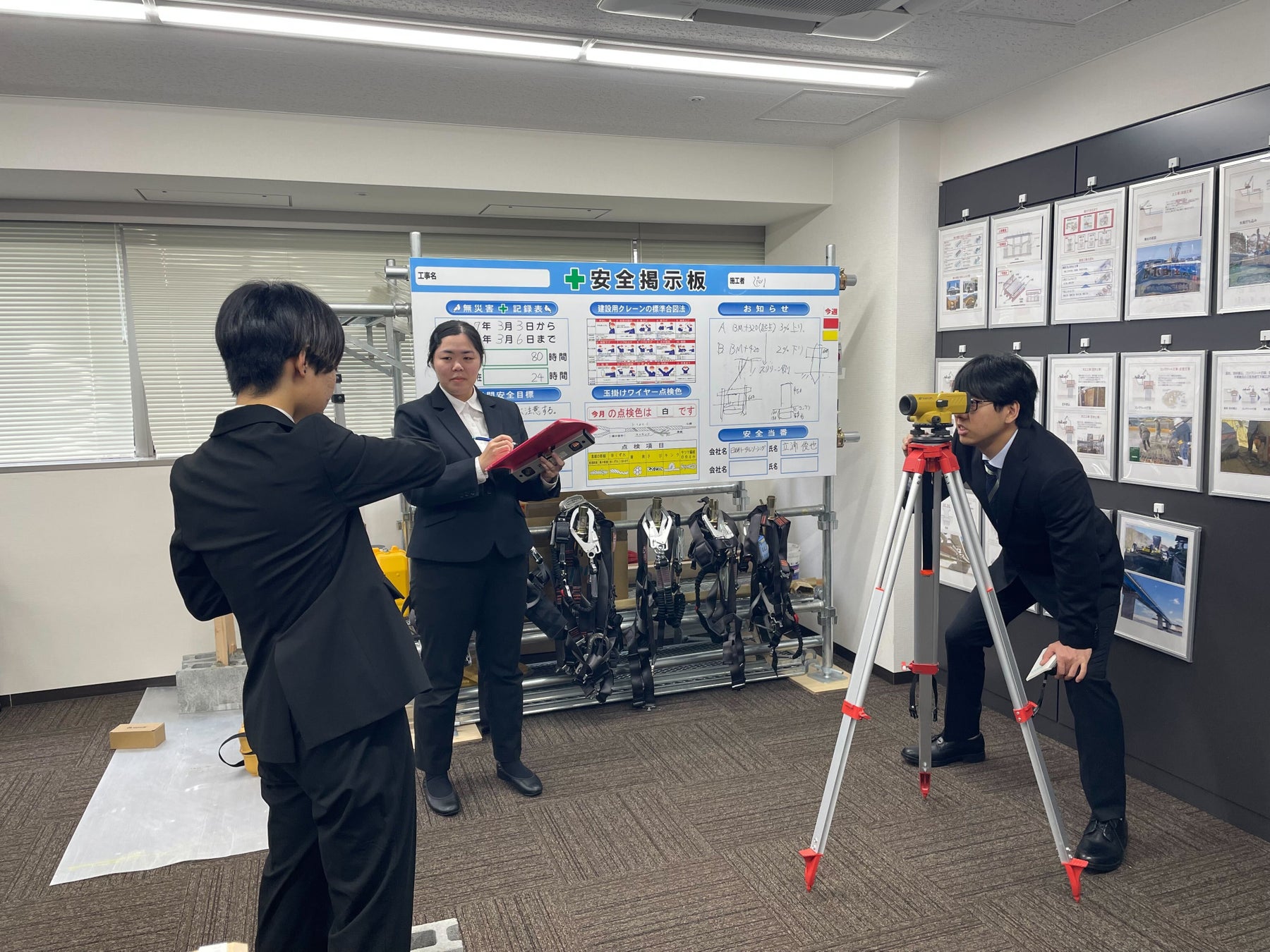 今回の拡張移転により実技スペースも新設し、初めて建設現場で就業する若手人材の不安要素を取り除き、未経験でも安心して施工管理の仕事をスタートできる充実した研修カリキュラムと研修環境を整えることができました。新設した実技スペースでは、土木で測量に使用する機材を用いた実技研修や、足場や安全掲示板を用いた体験型安全研修も実施可能です。
