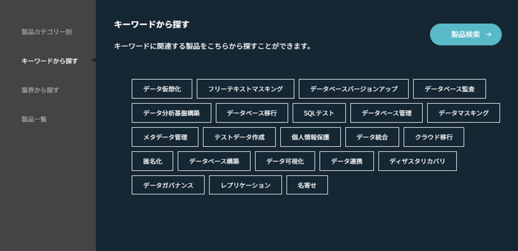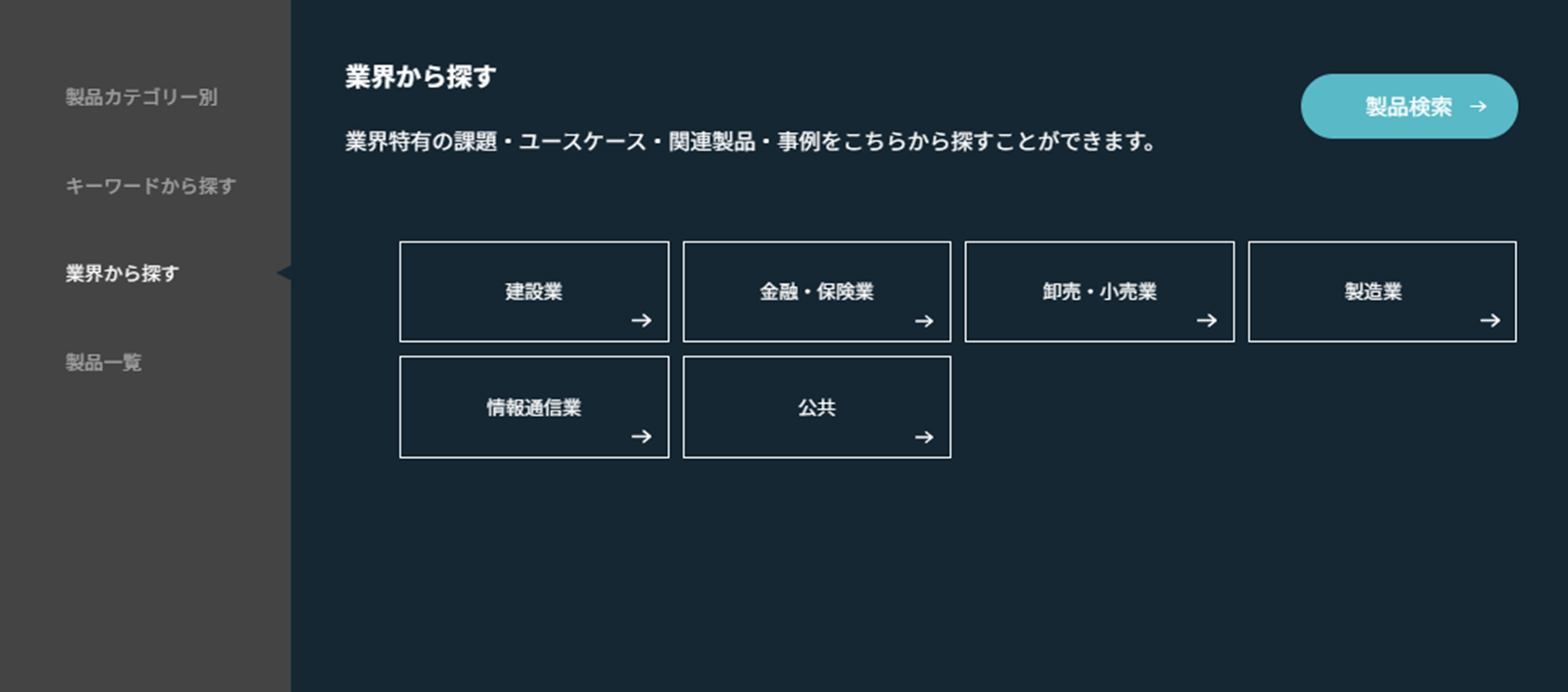 トップページやグローバルナビゲーション上に必要な製品が一目で探せる製品マップを配置したほか、業界や課題キーワードといった新たな切り口からも製品を探すことができるようになりました。