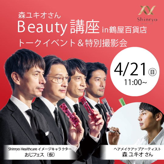 トークイベントではヘアメイク歴28年、数々の女性誌の表紙も手掛ける森ユキオさんご自身の経験に基づき、水素の体感や水素の最新研究をご紹介します。水素は日々トピックスが更新されており、高濃度水素ゼリーが、水素サプリメントとしては日本初※の機能性表示食品として受理されたほか、 日本食糧新聞社主催の「令和5年度 新技術・食品開発賞」を受賞するなど一層注目を集めています。ゲストには、Shinryo Healthcareイメージキャラクターを務めるメンズモデルユニット・おじフェス(仮)をお招きします。森ユキオさん、おじフェス(仮)のみなさんの若々しさの秘訣と、健康や美容に関するお話を繰り広げます。