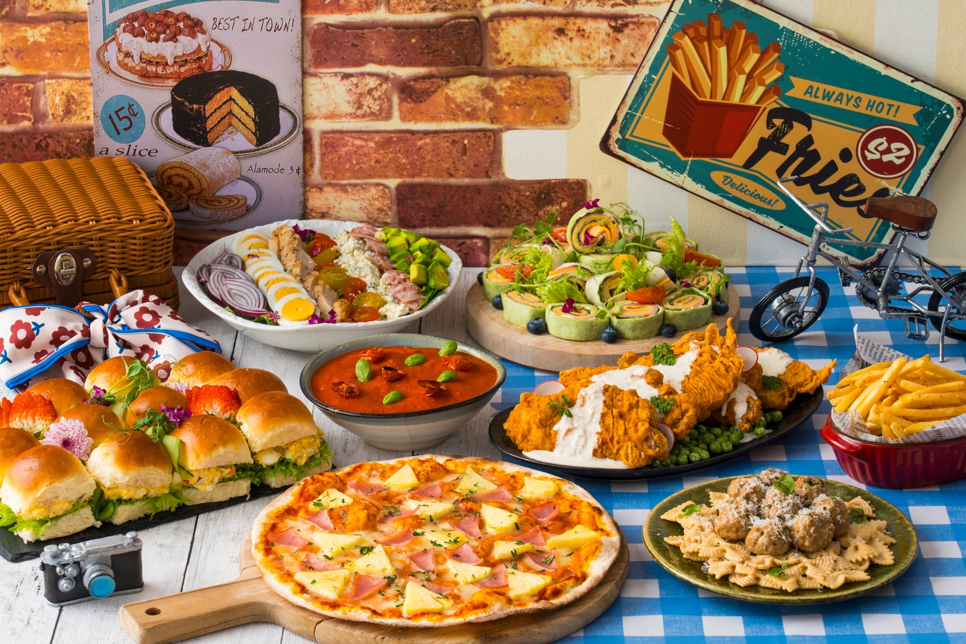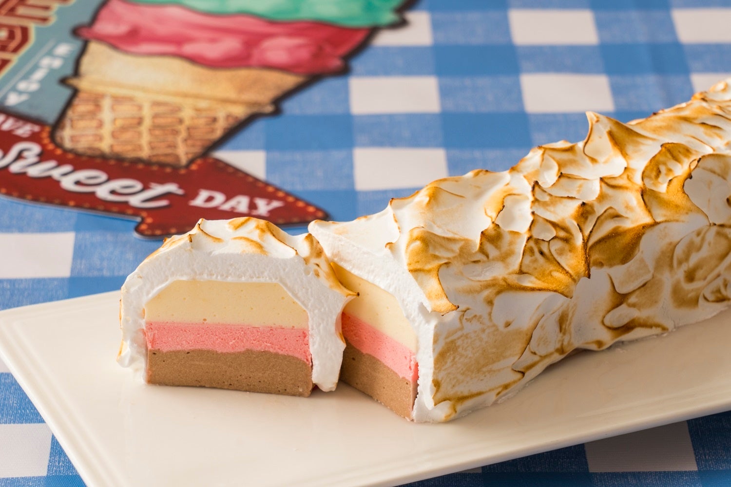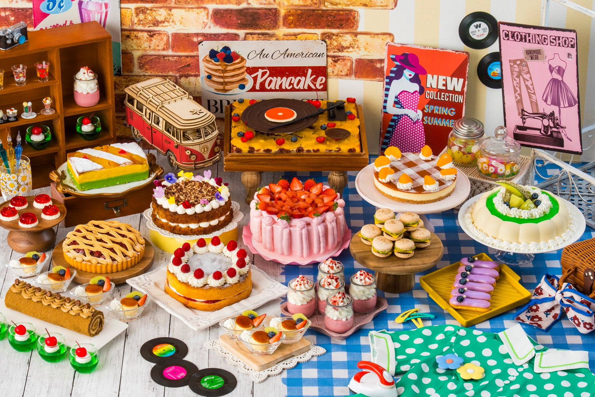 グリオットチェリーとカシスの酸味を効かせたパンナコッタに、生クリームとフリーズドライストロベリーを乗せた「ホリデーシェイク?!」や、メロン風味のゼリーに生クリームとチェリーを乗せ、”レトロスイーツ”の代名詞であるクリームソーダをイメージした「メロンクリームゼリー」、パイナップルの酸味とバターのリッチな風味が相性抜群のアップサイドダウンケーキを、鮮やかなイエロー&グリーンカラーでポップにアレンジした「クラシカルポップ・アップサイドダウンケーキ」、ライブステーションでお届けするクラシックアイスクリームケーキ「ベイクド・アラスカ」など、ノスタルジックなスイーツを心行くまでお楽しみいただけます。