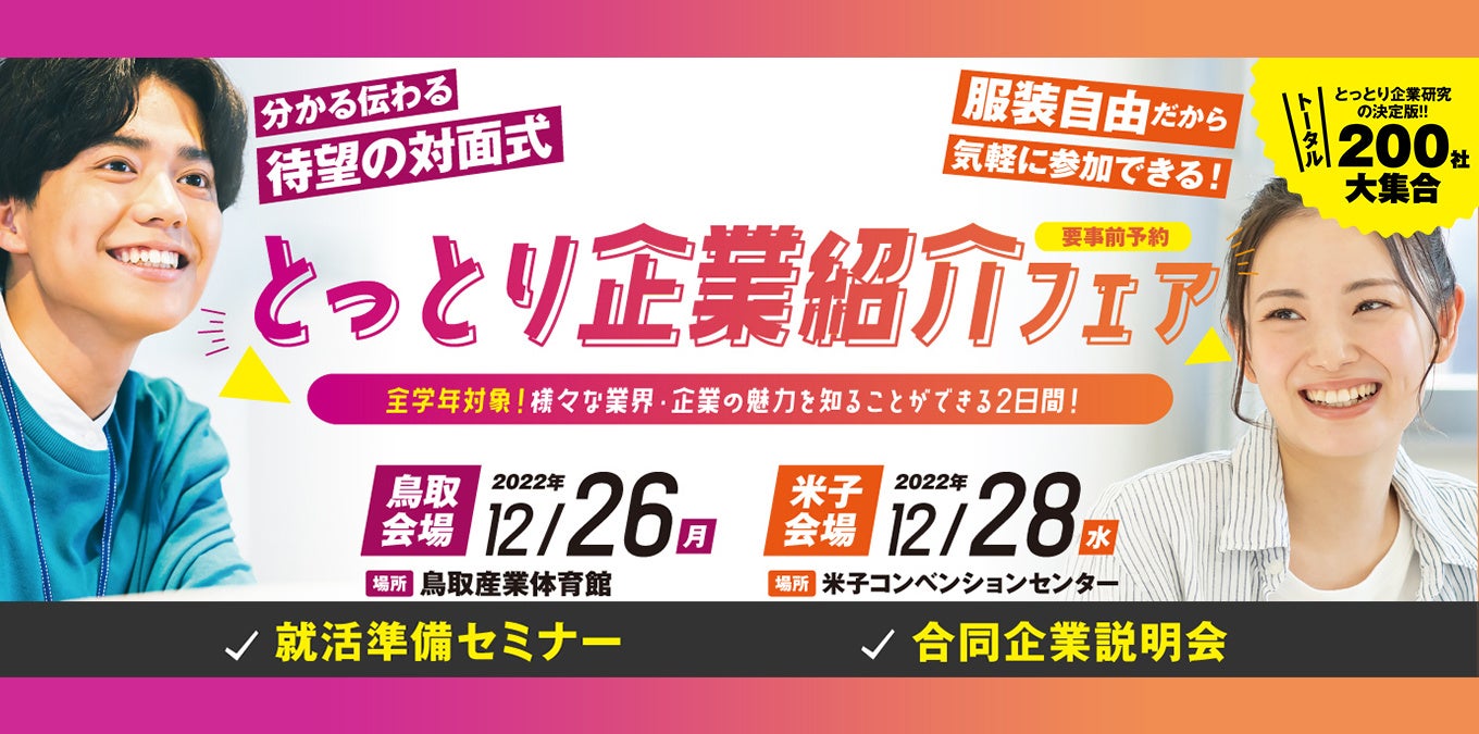 鳥取県・鳥取労働局(ハローワーク)・公益財団法人ふるさと鳥取県定住機構は、大学等に在籍する全学年の学生に対し、会社概要や業務内容等の情報提供を行うために、「とっとり企業紹介フェア」を2022年12月26・28日の2日間、鳥取市と米子市で対面式にて開催いたします。