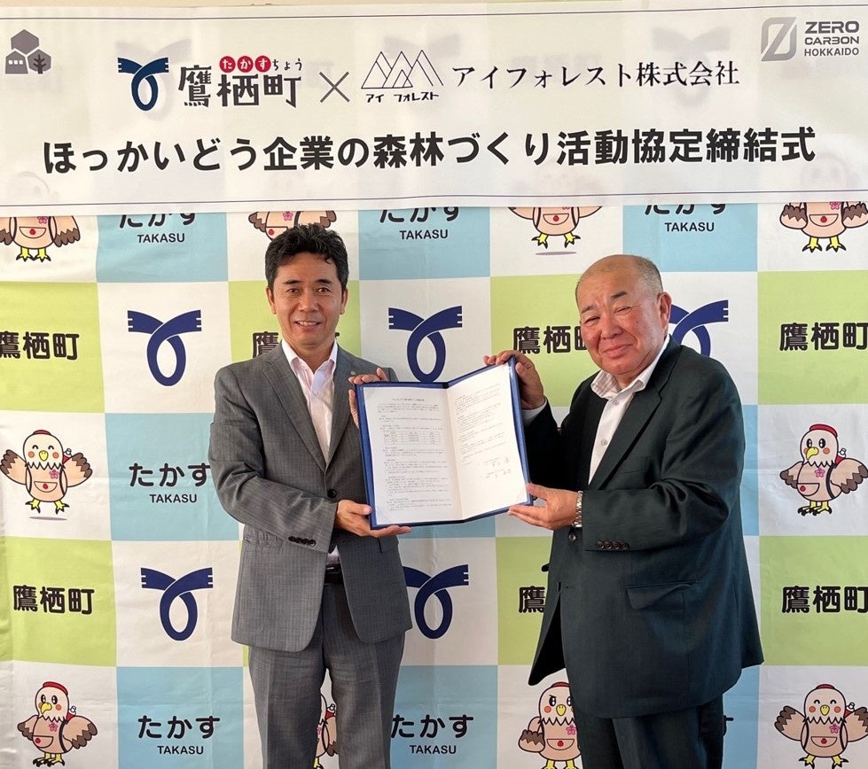 この度新たに、アイフォレスト株式会社と鷹栖町がほっかいどう企業の森林づくり活動協定を締結しました。8月24日(木)に開催された締結式には、アイフォレスト株式会社から井上代表取締役と鷹栖町から谷町長が出席し、協定書へ署名、上川総合振興局から上田副局長が出席し立会をしました。本協定により、アイフォレスト(株)は、鷹栖町の町有林のうち26.78ヘクタールの区域に係る間伐支援を、3年間にわたり行っていきます。