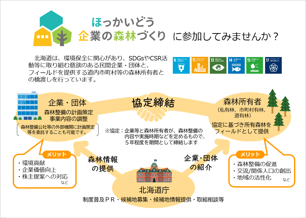 北海道では、環境保全に関心があり、SDGsやCSR活動等に取り組む意欲のある民間企業・団体と、フィールドを提供する道内市町村等の森林所有者とのマッチングを行う「ほっかいどう企業の森林づくり」制度により、企業等と連携した森林づくりを推進しています。