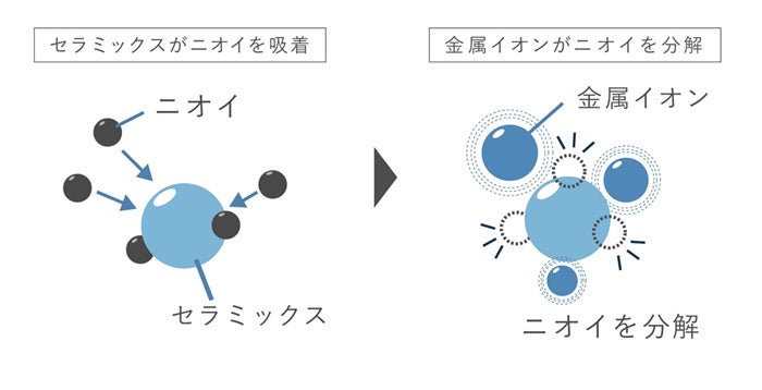 「セラミックスが吸着」、「金属イオンが分解」というWのスピード消臭で、汗臭・皮脂臭・加齢臭・生乾き臭など、幅広いニオイに対応。30秒で80%以上のニオイ成分を消臭します。