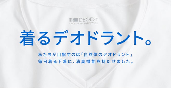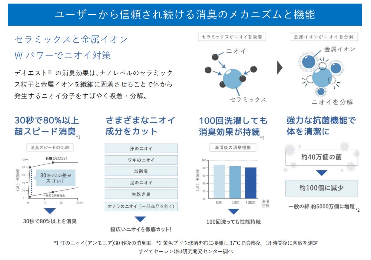 セーレンは2005年より広島大学の医学博士・大毛宏喜教授 監修のもと、高性能消臭製品の研究・開発をスタートしました。ナノレベルの特殊セラミックスでニオイを吸着し、金属イオンでニオイを分解する消臭メカニズムを開発し、加齢臭や汗などの“体臭”や“おなら”など身体から発せられる多様な“ニオイ”を瞬間的に消臭し、かつ洗濯にも耐久性をもつ素材を開発する事に成功しました。2011年より「デオエスト®」としての販売を開始し、強力な消臭機能を活かしながら、インナーとしての着心地、快適性のため繊維技術を余すことなく投入し、着用シーンに合わせた商品を数多くラインアップしております。