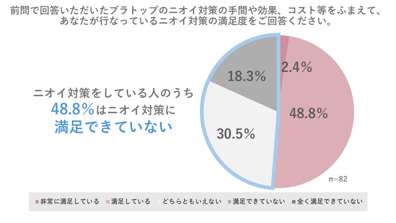 という声が寄せられ、つけ置きや手洗いなど、ブラトップのニオイ対策をしている人のうち約半分の人は、ニオイ対策に満足できておらず、ブラトップのニオイに問題を感じているようでした。汗や皮脂が入り込む胸パッド部やゴム部分は特に乾きにくく、ニオイが再発しやすい部位となっているようです。